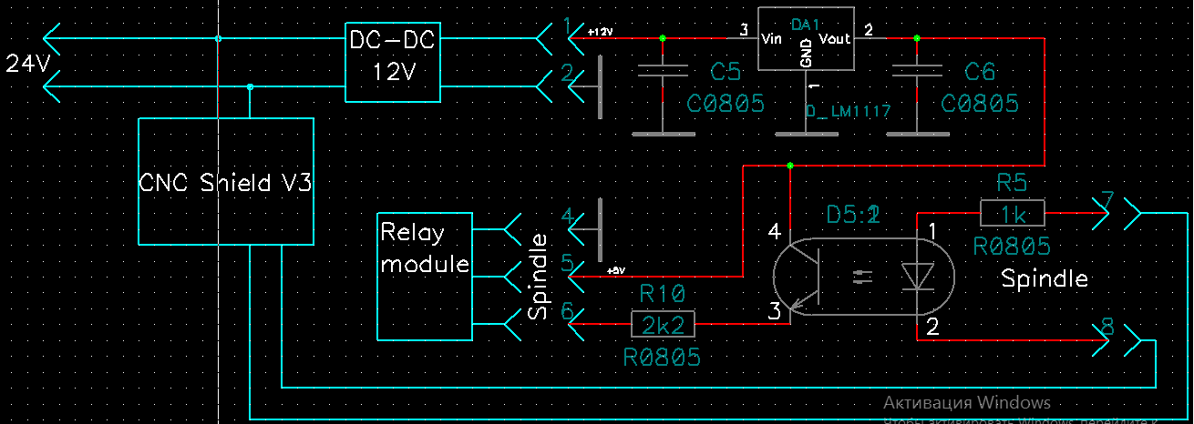 Приветствую, соратники. Хочу поделиться своим опытом. Собрал мелкий граверчик, управляет им ардуина с шилдом v3. В качестве шпинделя временно стоит гравер, планирую поменять на 200Вт китайский "шпиндель". Шпиндель управляется релюшкой. Добавил концевики, включил их в прошивке. Стали они срабатывать при включении шпинделя. Даже при обесточенной силовой части. Сделал релюшке опторазвязку. Схема:
