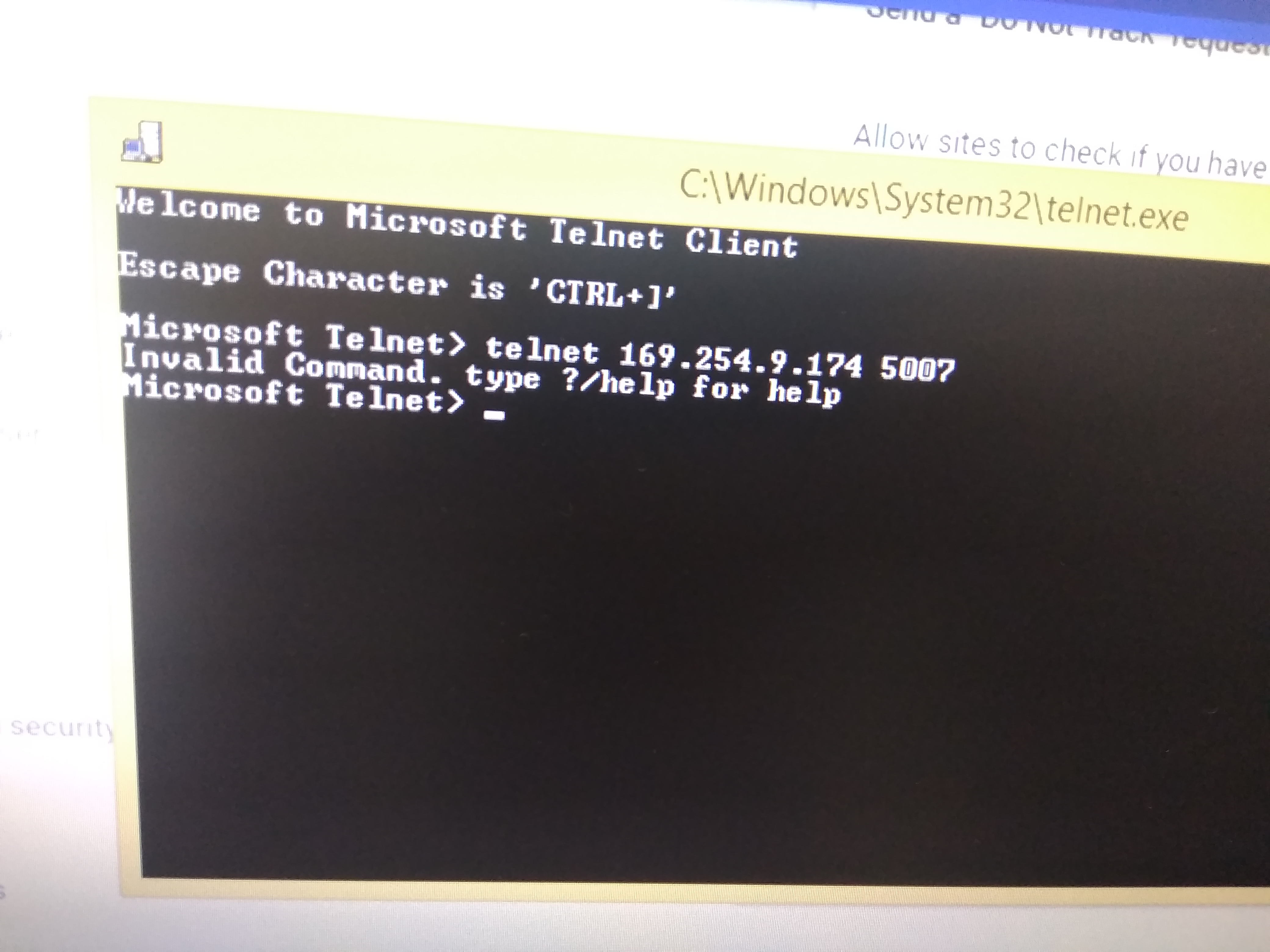 3. на пк напускаю telnet.exe , если прописываю telnet 169.254.9.255 5007 ошибка, если open 169.254.9.255 5007 - connecting 169.254.9.255 5007 - и зависает, соответственно другие команды нельзя вводить