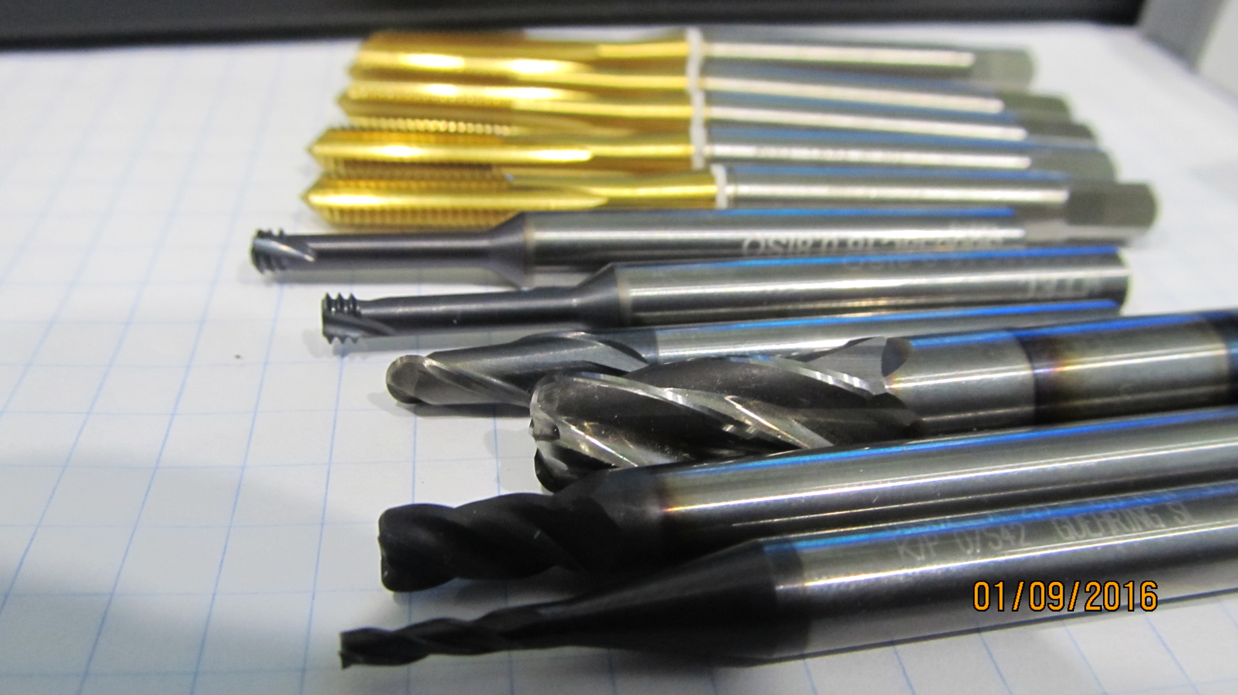 метчики М5, резьбофрезы, сфера, концевая и 2 концевые с радиусной кромкой. Жаль денег мало взял, там такие фрезы под СМП можно было сторговать, но замерз, обленился, спешил...