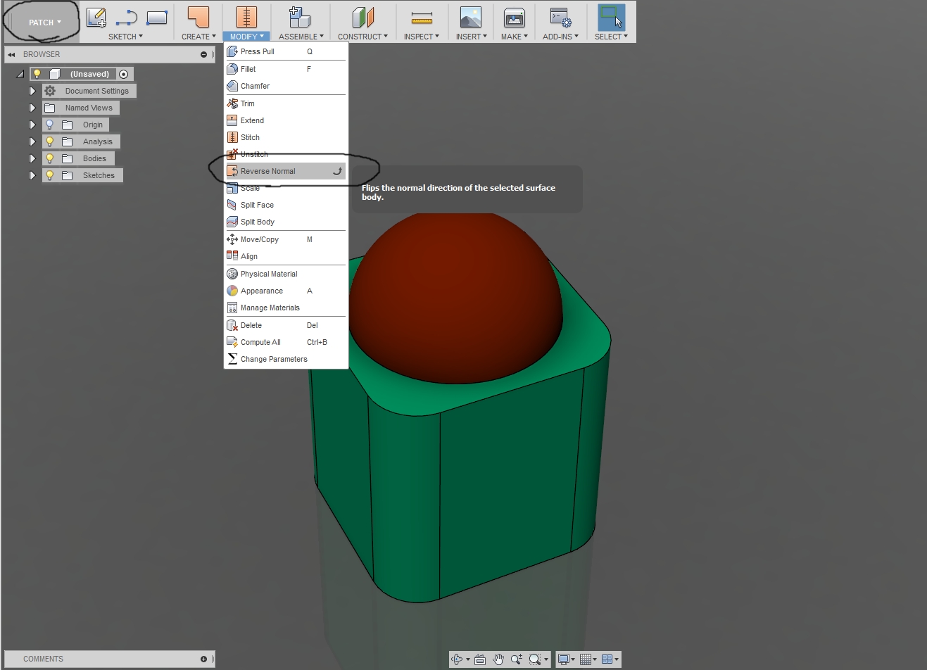 Чтобы изменить направление нормали, похоже придётся через экспорт/импорт делать, в среде PATCH: Проще решения пока не нашёл. Не было надобности. Попробую вечером поковырять ещё и попробовать.Taganrog писал(а):Подскажи пожалуйста где это искать.NKS писал(а): стоит проверить направления нормалей поверхностей.