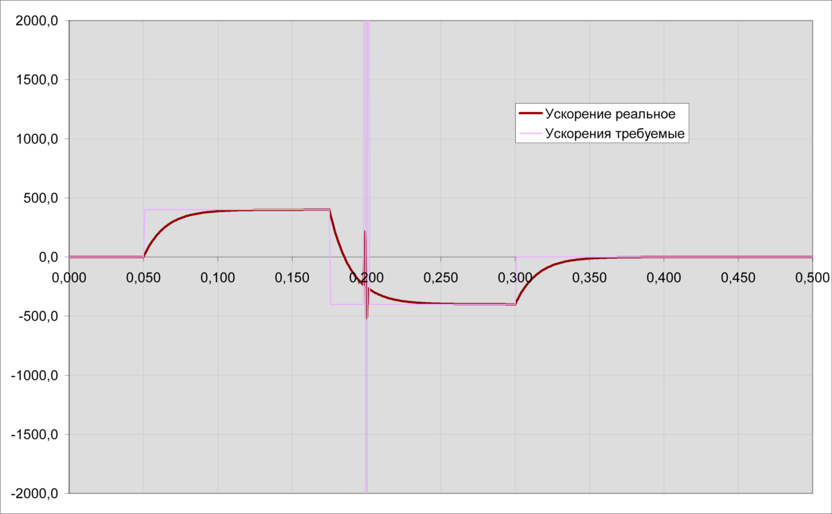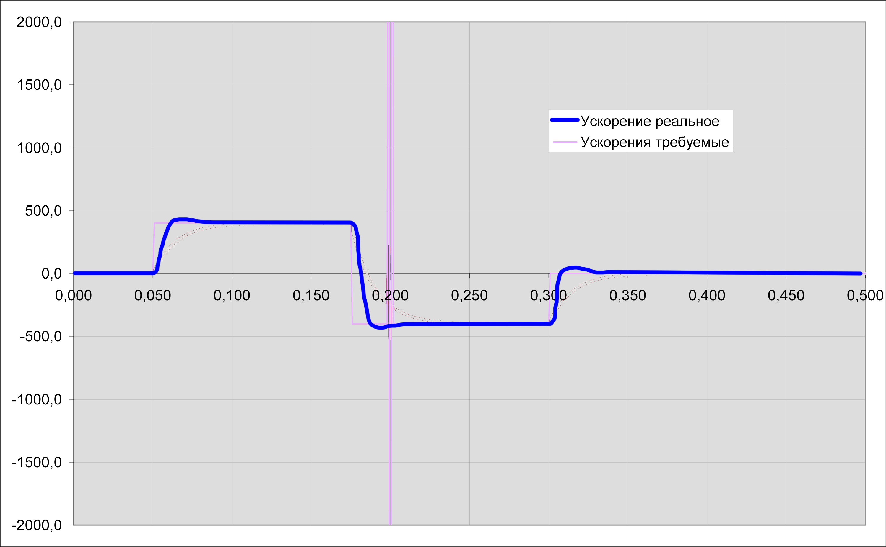 Этот график уже не актуален. Сейчас логика работы изменилась. Сейчас после фильтрации всплеска практически нет, а ускорение меняется примерно так (кстати, заодно, получились S-кривые ускорения):