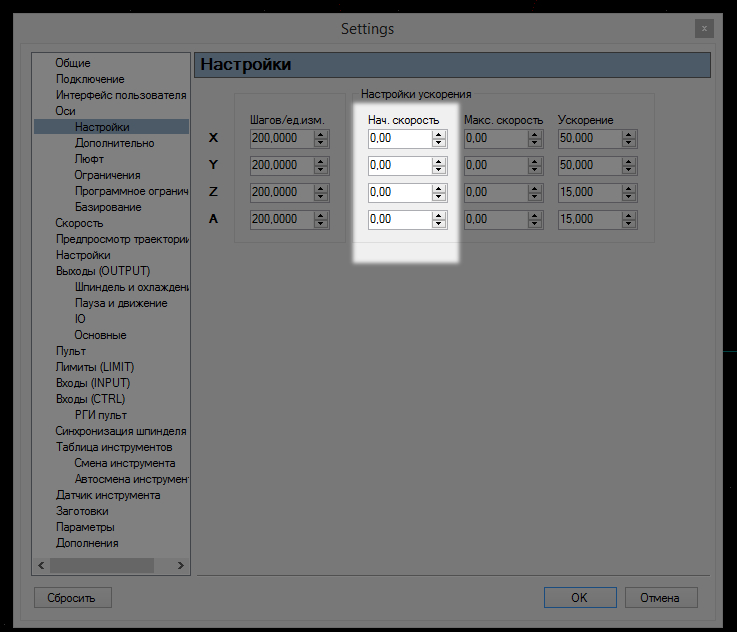 Для начала минимальные скорости для разных осей разные, потом - максимальные, потом - изменить количество шагов на мм. Ускорение можно не менять, оставить 15.