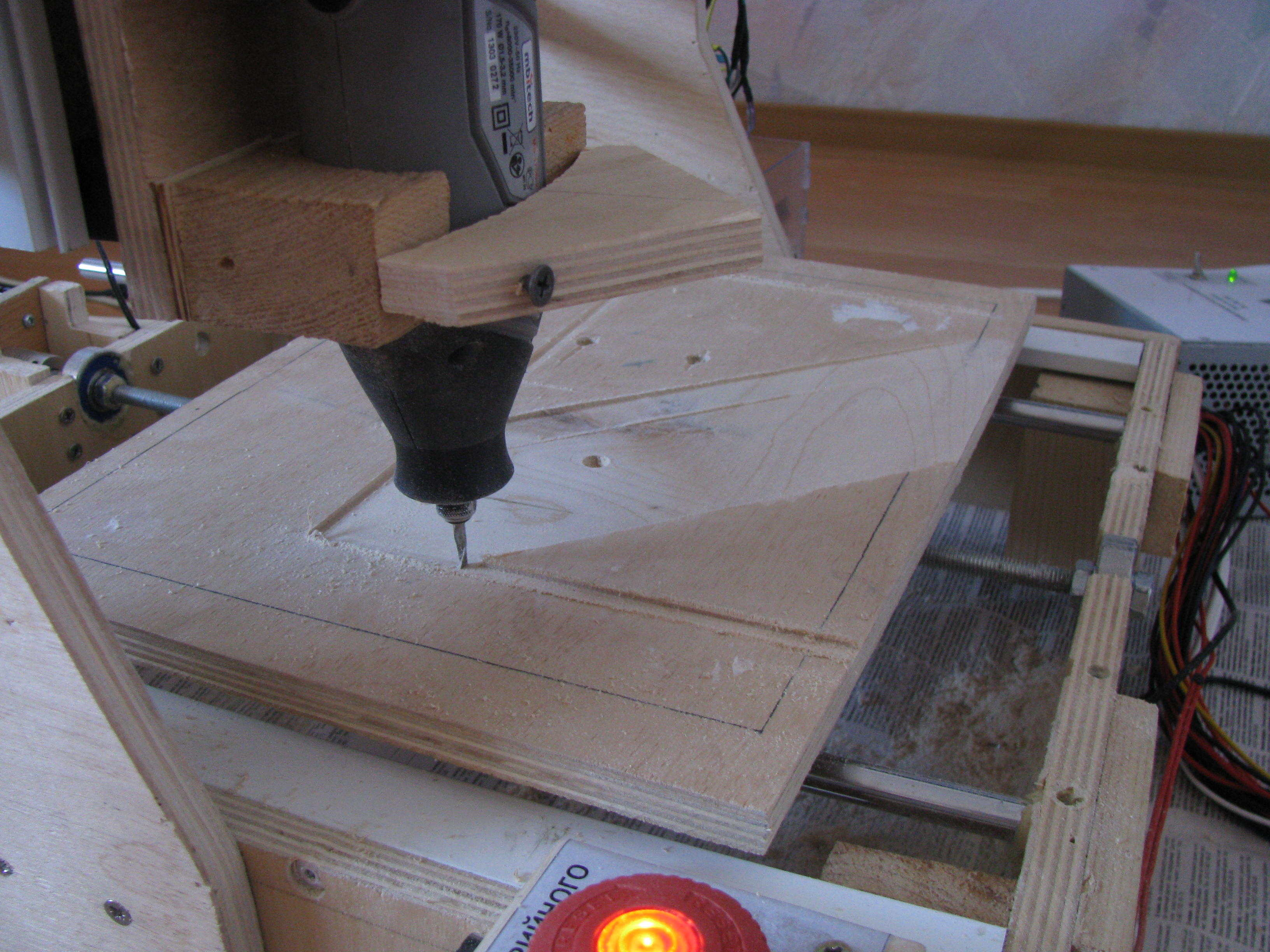 Выпало свободных 2 часа, отфрезеровал в общей сложности половину стола, процесс идет медленно, но верно, снизил скорость шпинделя до 15000об/мин, дальше падает момент. Repetier что-то наврал мне про то, что расчетное время 3часа, это время уже прошло, а выполнена только половина работы. Как фрезерну стол, увеличу максимальную скорость до 5мм/сек, пока что стоит 3мм/сек.