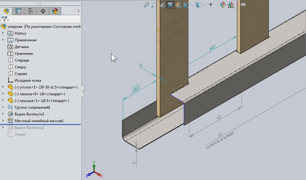 Задумка была сделать линейный массив (шаг подбирать) ламелей, потом по нему массив вырезов в коробе, и чтобы это всё управлялось конфигурациями деталей. Поменял конфу уголка с s1 на s2 -- ламели и вырезы в коробе сдвинулись Х+. Поменял толщину ламели -- вырезы скоректировались в ширину. Подвигал начальную ламель или поменял шаг -- передвинулись по длине.