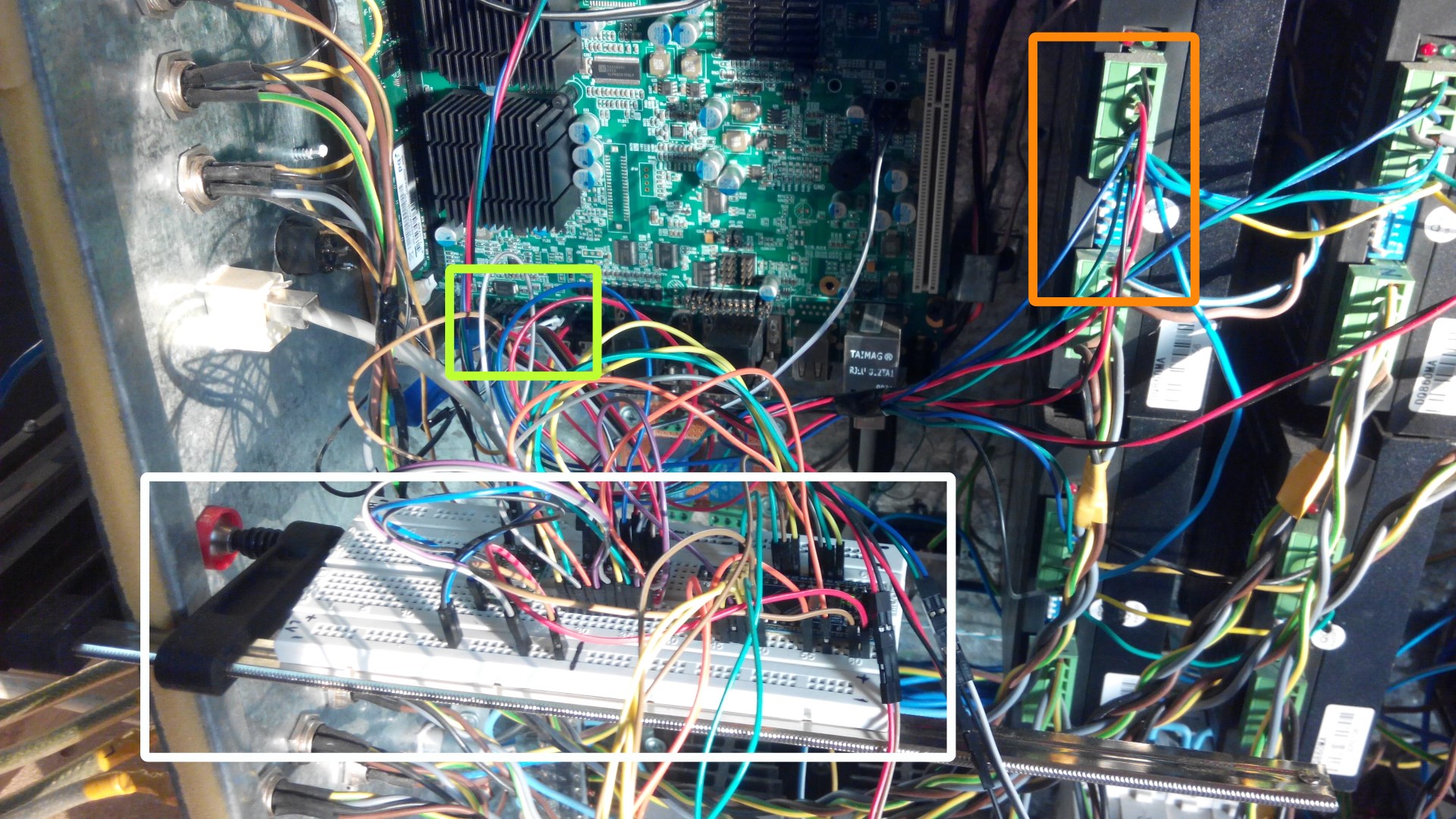 Сегодня часа 4 ушло на последовательные тесты умножителя в деле - на станке. Поставил электроящик на стол. К стенке ящика прикрутил струбцину и на неё установил монтажную платку с умножителем. Умножитель подключен к LPT порту. Питается умножитель прямо с материнки от 5V. Управление - LinuxCNC. На монтажной платке расположились 3 модуля: