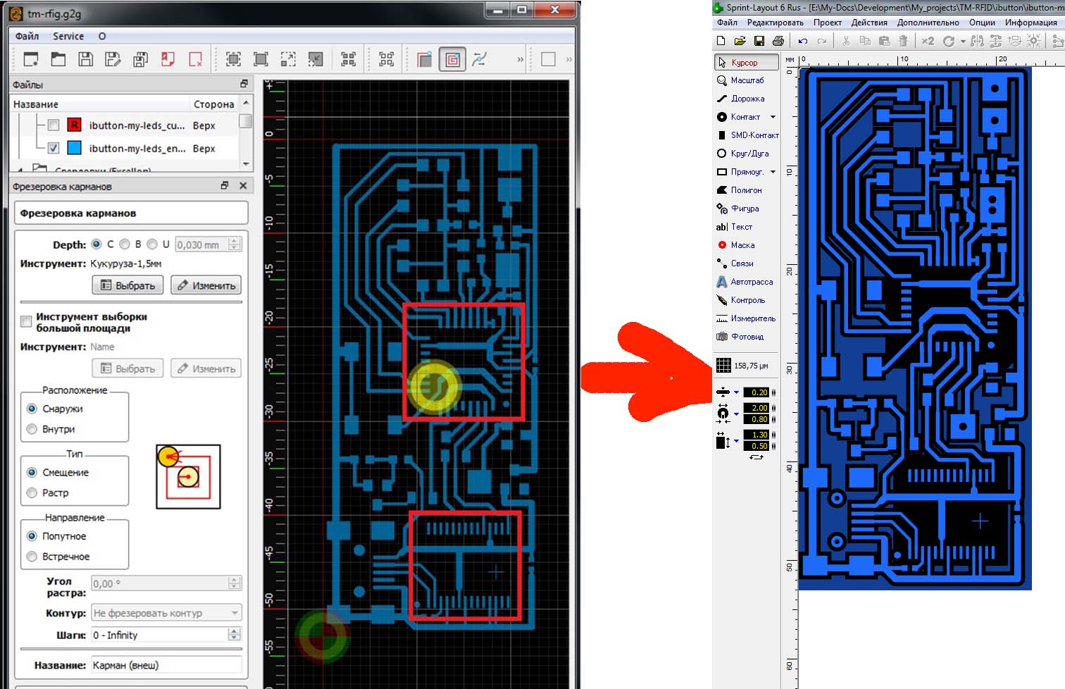 Не всё так просто. С одной стороны функциональность вырезания по контуру в G2G имеется. Но с другой стороны она там подразумевалась для обрезки платы или каких-то больших отверстий с соответствующим инструментом типа большой фрезы. В то время как здесь надо будет применять тот же инструмент, что и для фрезерования дорожек (0.1 мм), но при этом для прорезания отверстий по контуру (наверняка в несколько проходов). Конечно же тоже ничего фантастического, но у меня нет уверенности, что этот вопрос обдуман и оптимизирован в данном ПО. Тем более, что автор убегает от всех вопросов на эту тему.