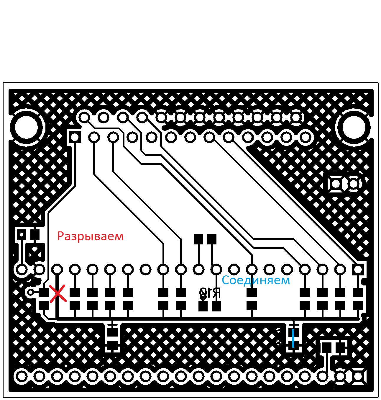 так я предлагаю заменить у всех подтяжку с "к 5 В" на подтяжку "к GND" (Кроме ШИМ). Чтобы меньше паять.. Для этого мы отрезаем шину 5В которая является общей для резисторов подтяжки, и подсоединяем её к GND (Т.О. мы прижмем все выходы к земле ). Но нужно будет отрезать от этой шины резистор выхода ШИМ и подтянуть его к 5В.(Чтобы было 0В на аналоговом выходе).