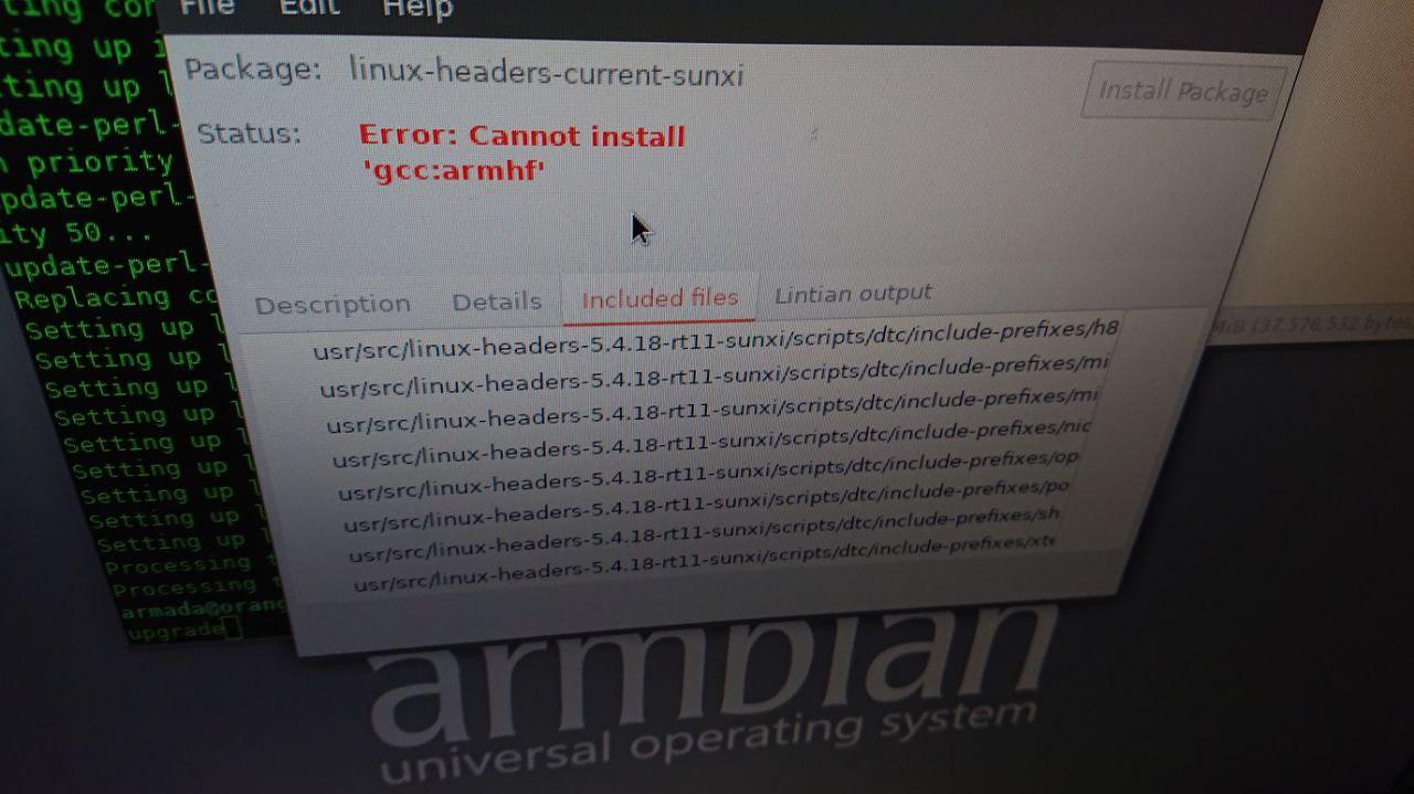 Плата Orange Pi PC 2. Система Armbian Busterdesktop mainline based kernel 5.4 скаченная с "официального" сайта. Пытаюсь установить linux-headers-current-sunxi_20.02.3_armhf.deb. Пакет rt ядра установился без проблем linux-image-current-sunxi_20.02.3_armhf.deb.
