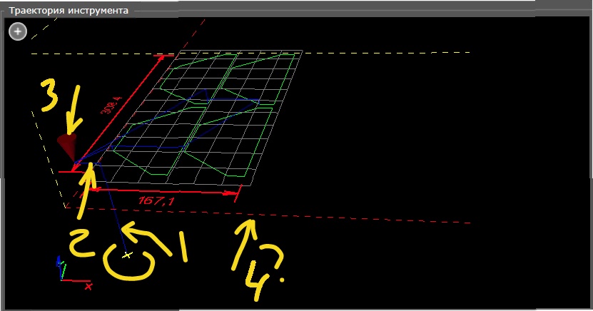 Данное перекрестие на визуализации у меня не совпадает с этой точкой почему-то. Оно находится намного ниже границы рабочей зоны станка (рамка окрашивается в красный цвет#4#). Лишних линий получается две - #1, 2#, по которым инструмент при выполнении УП не идёт. . Инструмент #3# уже находится в начальной точке старта УП.pm_dev писал(а):Желтым перекрестием обозначена начальная точка текущей выбранной для исполнения траектории (строки G-кода из файла УП)