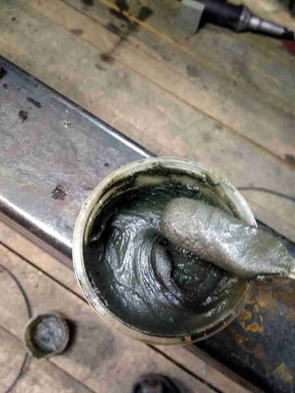 И грунтуем площадку. Механическое сцепление смолы с металлом тем лучше, чем она жиже.