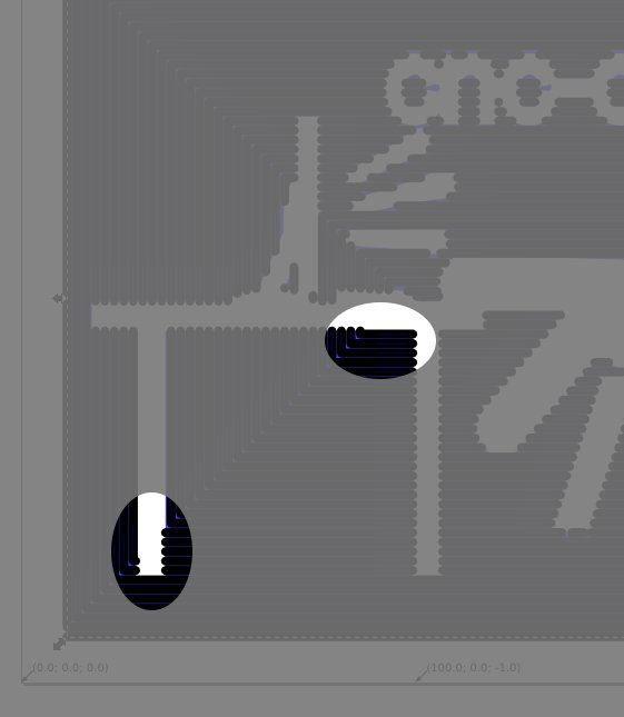 Теперь такое дело. Похоже на баг-репорт. Создаю заглавную букву "O", шрифт Dejavu Serif, кегль 72 в квадрате 25х25 мм. Обрабатываю (svg файл прикреплён). Пытаюсь сделать Area fill в gcodetools. Результат на рисунках.