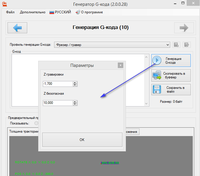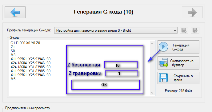 В котором можно в случае необходимости скорректировать значение, и нажать кнопку ОК, после чего генерируется G-код, формат профиля например будет выглядеть так: