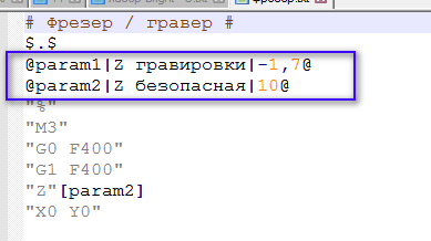 После закрытия окна будет сгенерирован G-код, в котором параметры будут вставлены в следующие места: