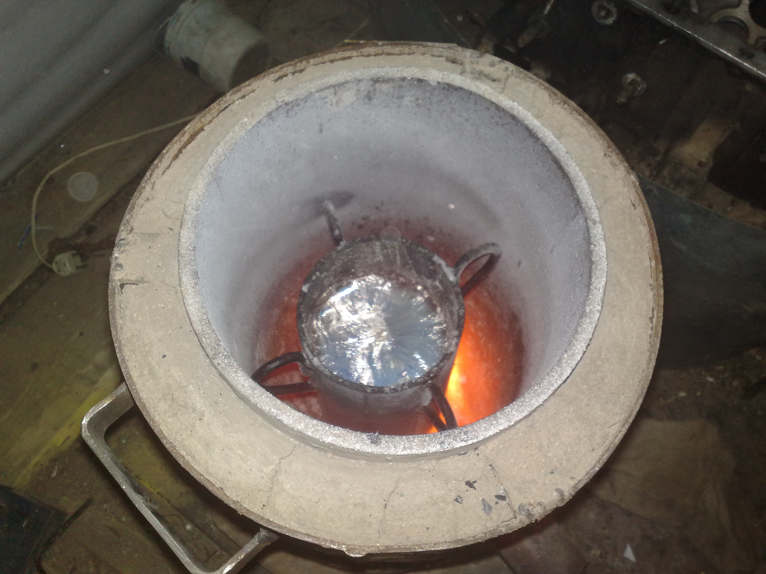 5. Дальше мнения расходятся. Одни предлагают сначала удалить пенопласт (вжечь или раствроить ацетоном), а другие сразу льют расплавленный Ал в литник до полного заполнения формы.