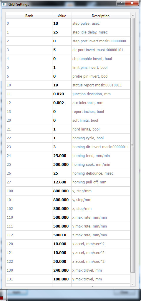 Сегодня зашел в GRBL setting и увидел что пункты hard limit ? homing cycle итп как в таблице у kip96 по нулям, кнопку апле нажимал когда единицы расставил а попробывав еще раз выставить GRBL controller прописал это https://yadi.sk/i/fDFLLLHp3CGMuw. А доллар 5ть это инверсия концивиков или вовсе их включение у меня по нулям было =)?