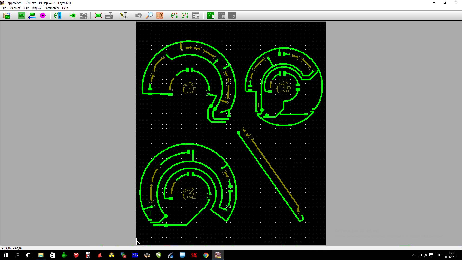 Попробовал сделать проводники толщиной от 0.1мм до 1мм. Фрезой 45 гр. 0.2 мм. Всё отлично. Радует глаз прям. Благодаря отдельным параметрам. Но попытавшись засунуть гербер с layout был удивлён. Большинство площадок под smd расположены неправильно, либо вообще не определились, окружности так же не определились толком.