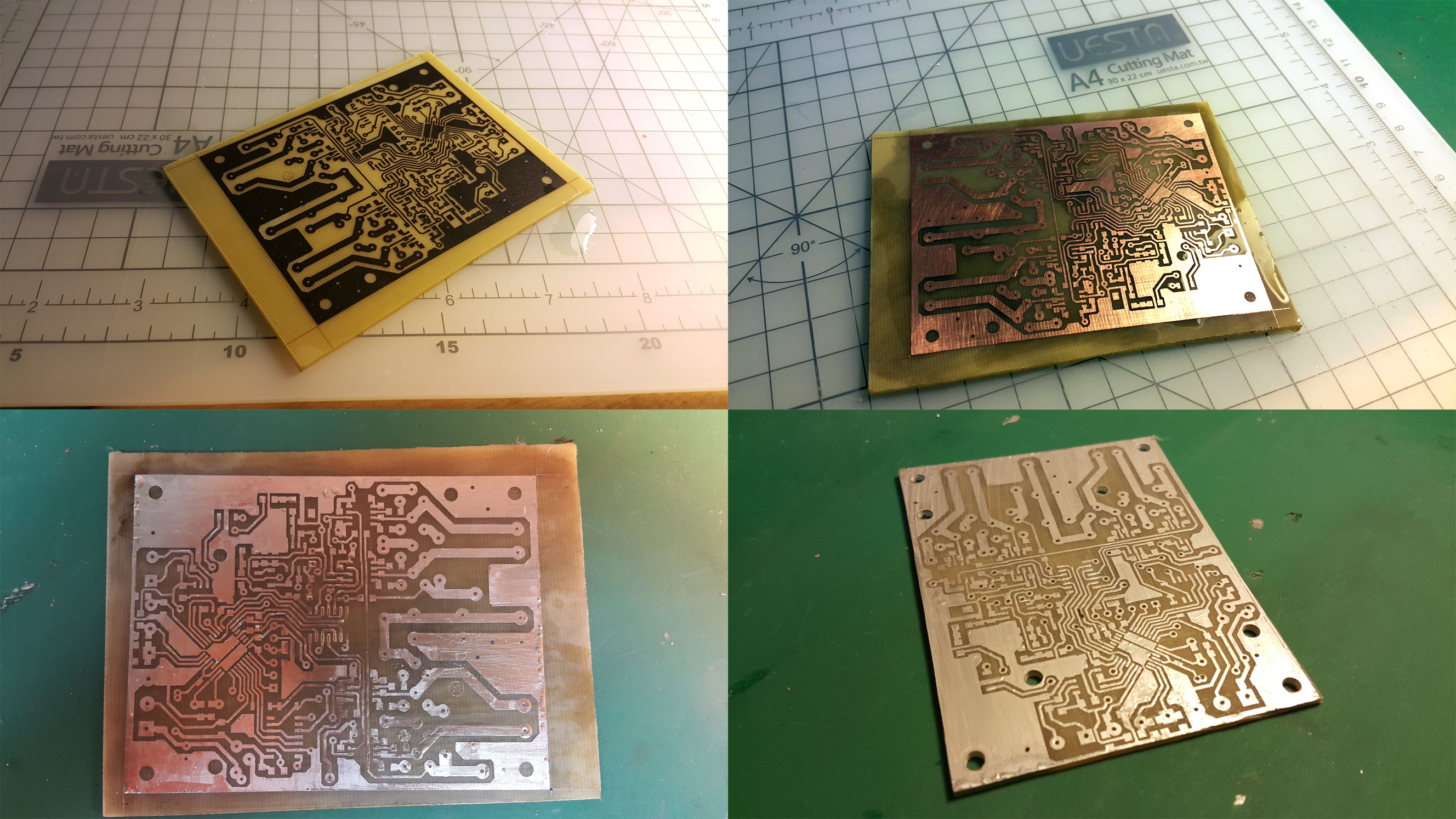 - 1 - печатаем схему на термобумаге лазерным принтером (для усиления тонера брызгаю спреем-усилителем), подготовка стеклотекстолита при помощи шкурки 800+, с дальнейшим обезжириванием спиртом