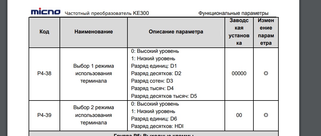 Параметры Р4-38 и Р4-39 позволяют осуществить задуманное: Таким образом, в нашем случае (для клеммы D3) нужно в параметре Р4-38 установить 00100 (единица в разряде сотен означает срабатывание при низком уровне сигнала для D3, т.е. при его пропаже, что нам и требовалось).