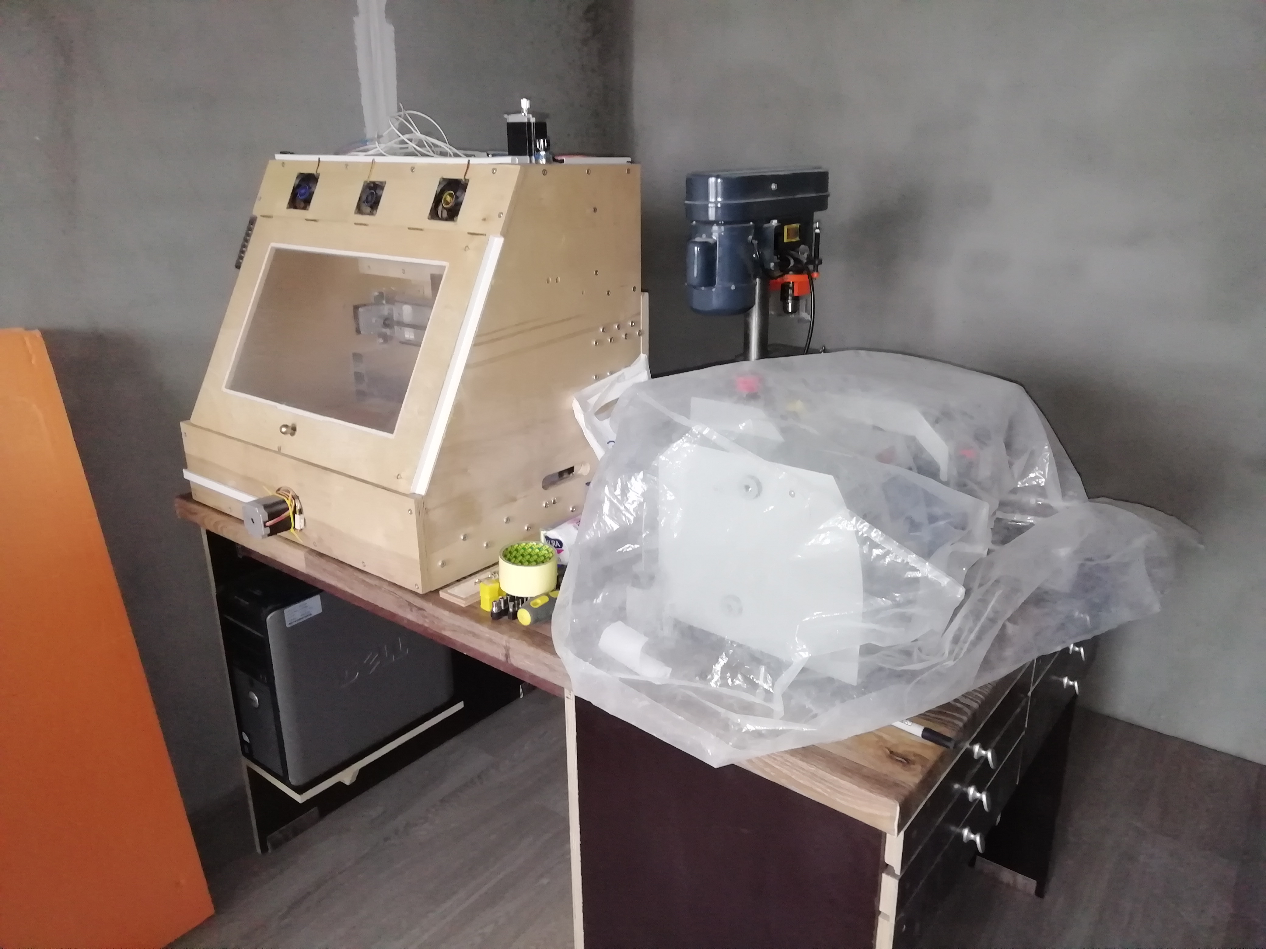 Давненько ничего не писал. Станок побывал уже и на даче, сейчас переехал на квартиру, доделана защита оси Y. В общем сделал пару фоток на новом месте.