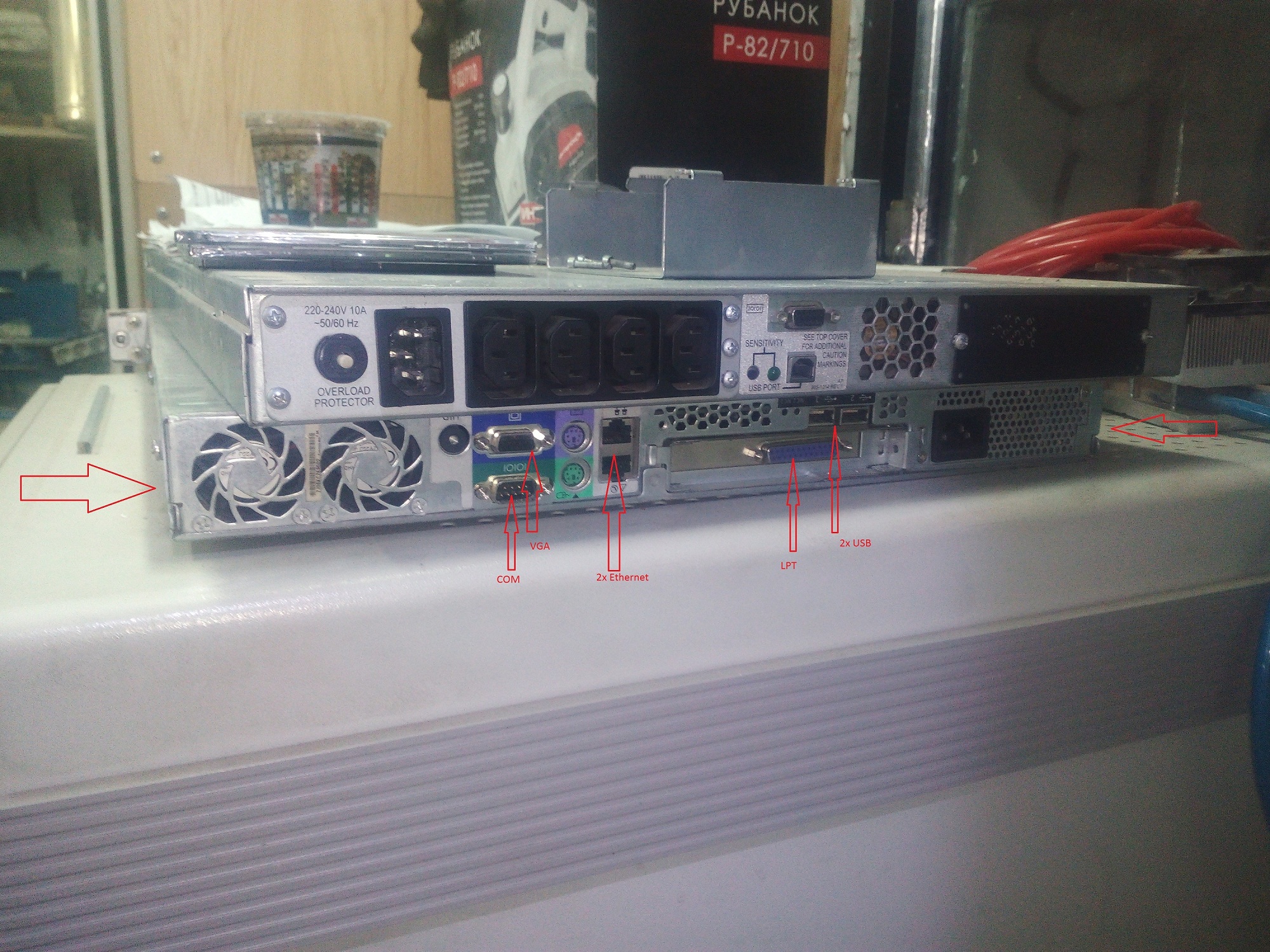 Порты: COM, 2xEthernet 1Gbps, VGA, 2xPS/2, 2xUSB (один порт USB сзади, второй на морде или внутри - выбирается переключателем)