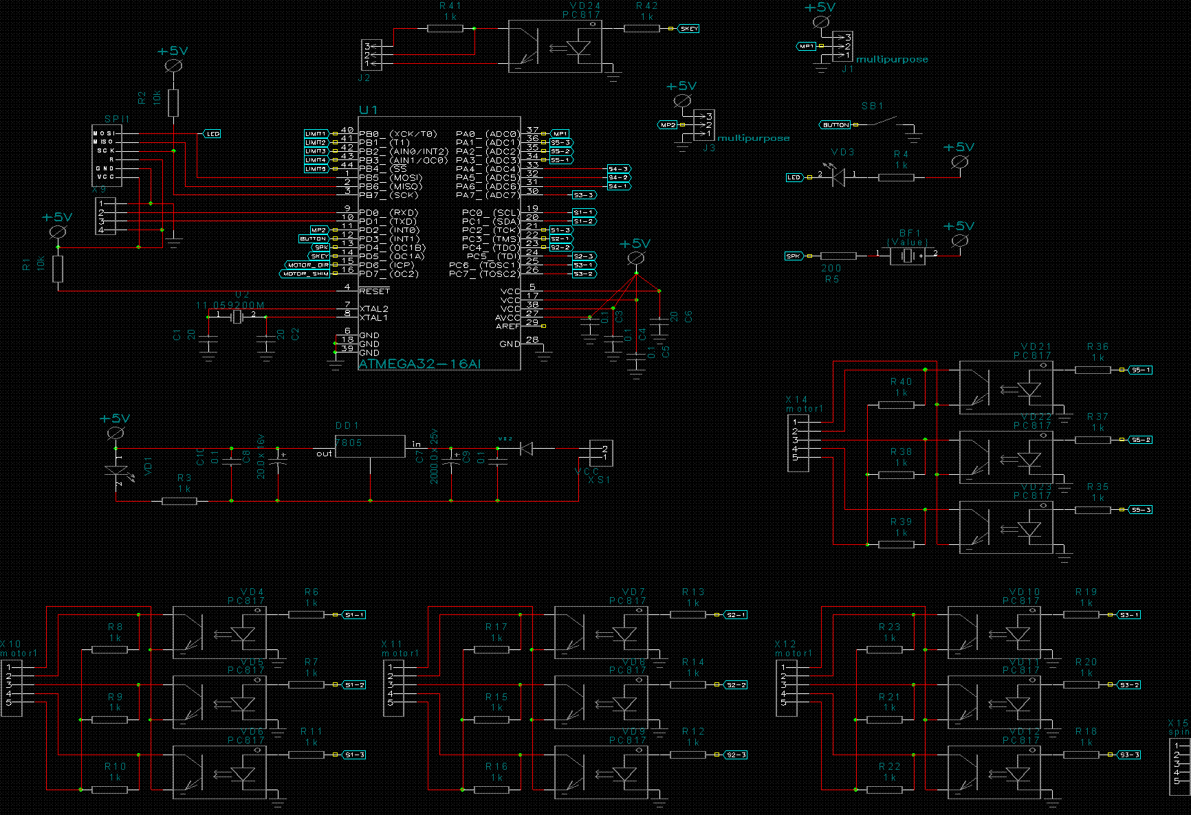 Чтобы не думалось что у нас все так запущено,... вот, в общем, накидал схемку. Там есть все. И пять осей по три пина и реле и кнопка с динапиком и светодиодом, 5 концевиков, два многофункциональных датчика, возможность подключения по spi внешней клавиатуры/дисплея, две линии с шимом для управления шпинделем. И опторазвязка по всем каналам выхода - где то 18 реле по 8 рублей каждая.