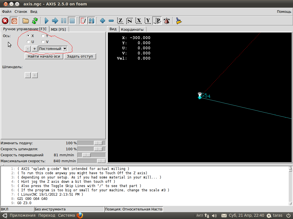 Подскажите плз. как вручную управлять осями U V? X Y Z g понятно стрелками и пролистыванием. И ещё. У кгог нибудь есть тестовый файл для проверки работоспособности 4-ч осевой пенорезки?