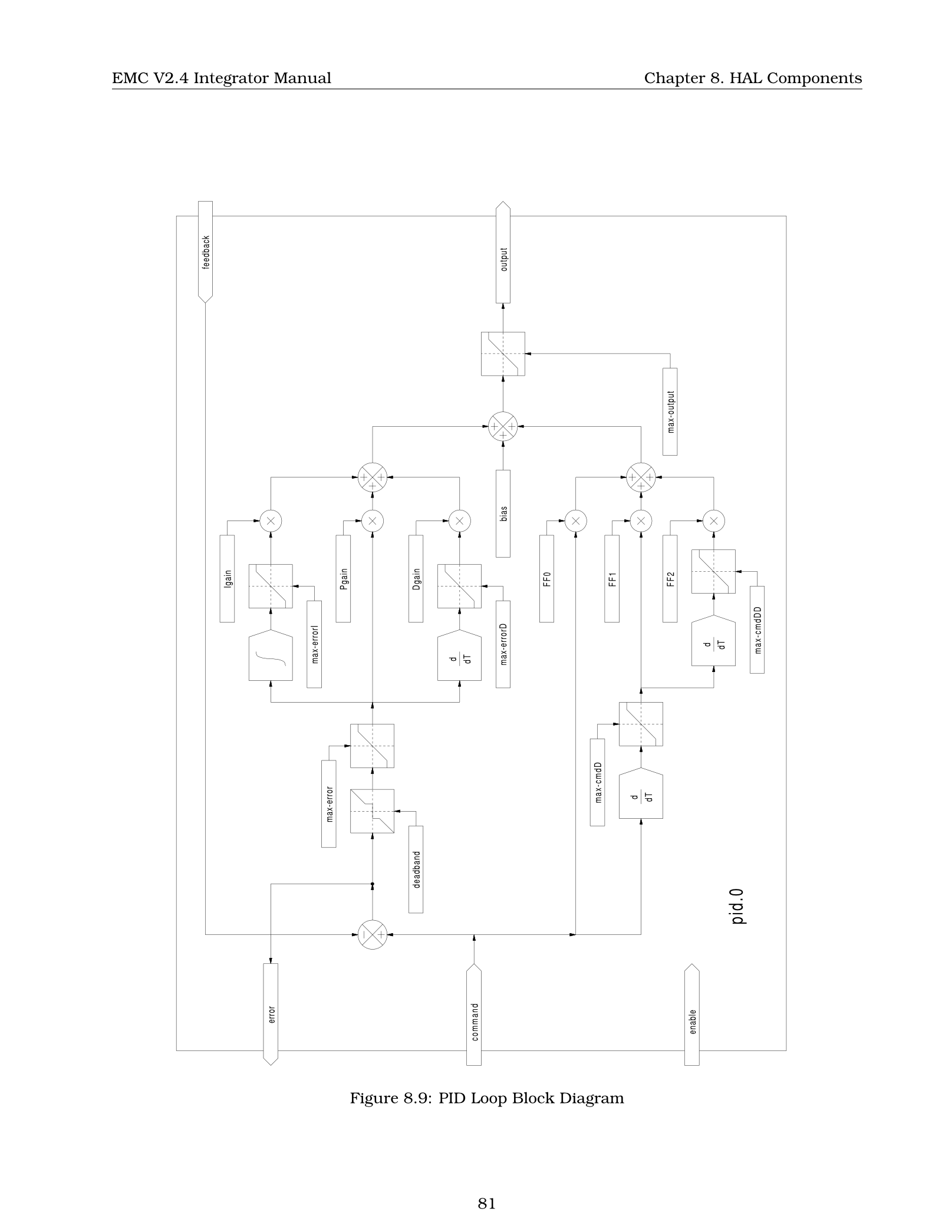 Этот компонент предоставляет Proportional/Integeral/Derivative циклы управления. Это компонент строго реального времени. Для простоты, это обсуждение подразумевает что мы говорим о циклах положения, однако, этот компонент может быть использован чтобы реализовывать другие циклы обратной связи, такие как скорость, длина пламени горелки, температура и т.п. Рис. 8.9 это блок схема одиночного PID цикла.
