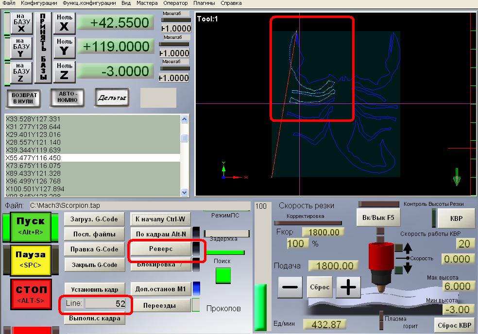 Nick писал(а):Как такового реверса нет, можно только выбрать строку, приехать в ее начало G0 в MDI режиме и стартануть с нее.