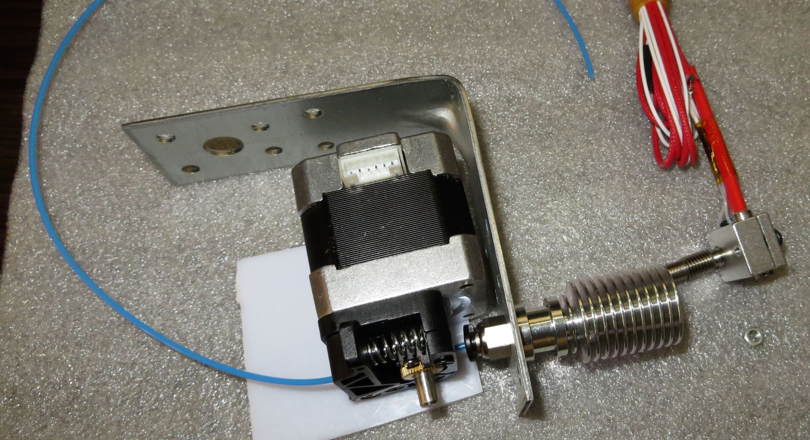 Также на уголок очень хорошо ложиться шаговый двигатель NEMA 17, с механизмом подачи пластикового прутка. Для крепления двигателя применяем алюминиевый швеллер 10*15 мм, в котором сверлим отверстия для крепления к двигателю и к уголку. А также отверстия для гайки Hot END 3d принтера и отверстия для хомутов, чтобы закрепить провод нагревателя, термистора и вентилятора, идущие от Hot END 3d принтера. В уголке сверлим два отверстия под 3мм резьбу для крепления швеллера и это ВСЁ.