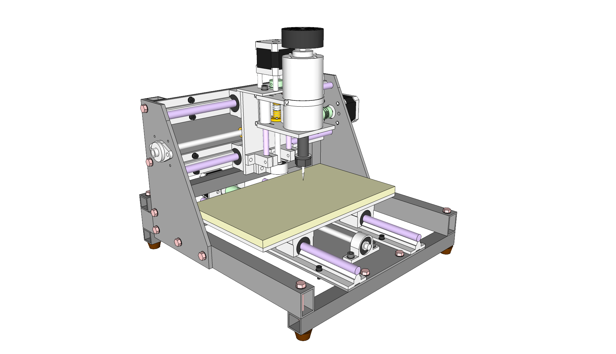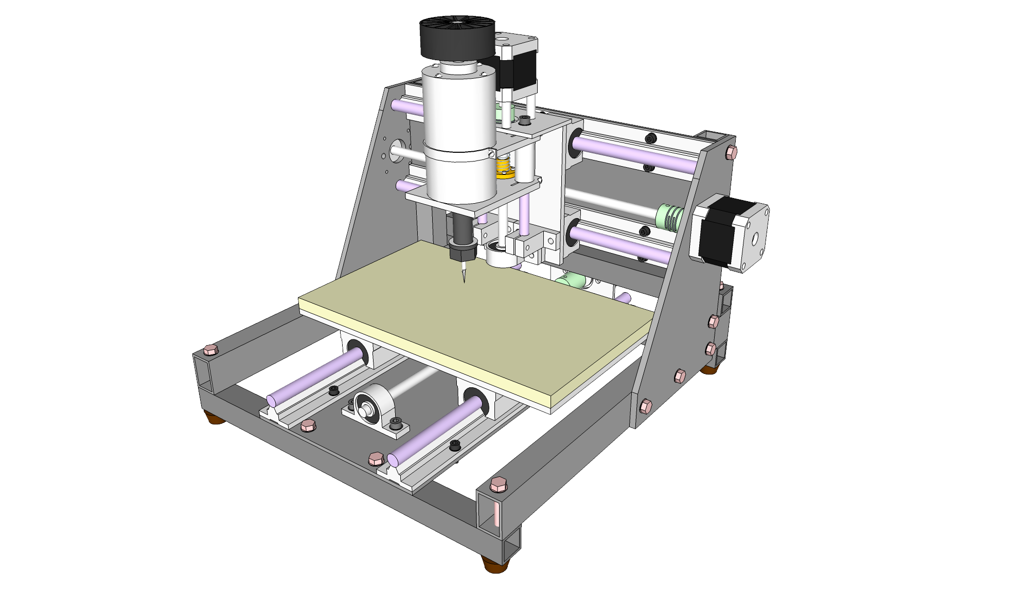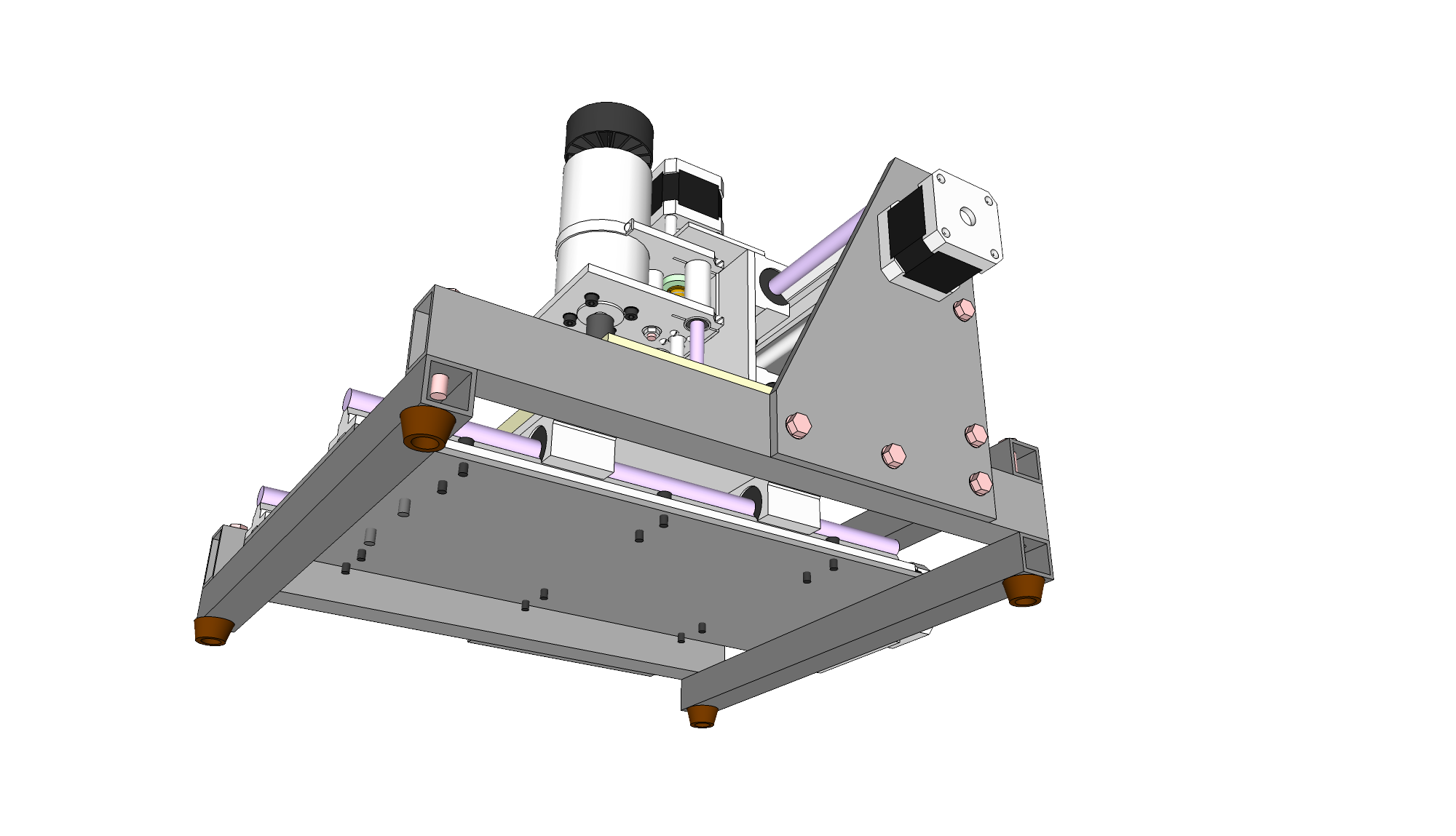 Следующая итерация. С учётом мнения общественности. Эскиз немного недоделан, кое-где отсутствуют гаечки, винтики, но в целом проект должен быть понятен. Серым обозначены стальные детали, белым -- из алюминиевого сплава. Розовые болты -- М6, серые -- M5, чёрные -- М4.