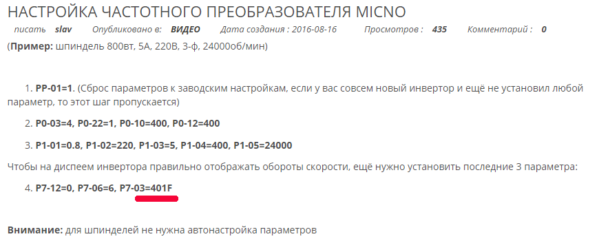 В Славиных руководствах по настройке частотника встречаются некоторые несоответствия. Нужно самому с мануалом подробно разбираться.шпиндель писал(а):а как частотник был настроен ? ..по видео от Славы ?