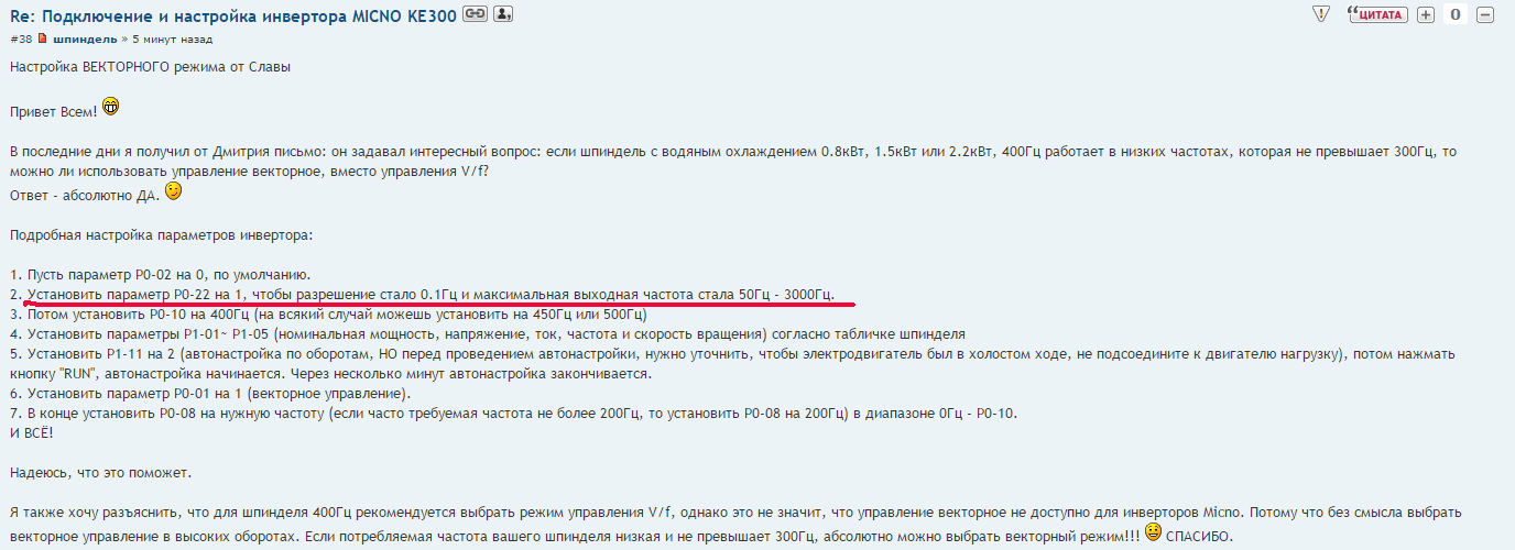 Ну и по настройке векторного непонятки. Векторный до 300Гц должен ставиться. Значит разрешение 0,01Гц надо выбирать, а это пункт 2 в настройках. Только тогда частоту выше 300Гц не выставить и только тогда моща в шпиндель на низах идет. А так как пишет он не получается векторный задействовать нормально.Байкалец писал(а):Сначала нашел на ютубе инструкцию, потом Славину, сегодня уже сам с инструкцией к частотнику сидел - все сходится.