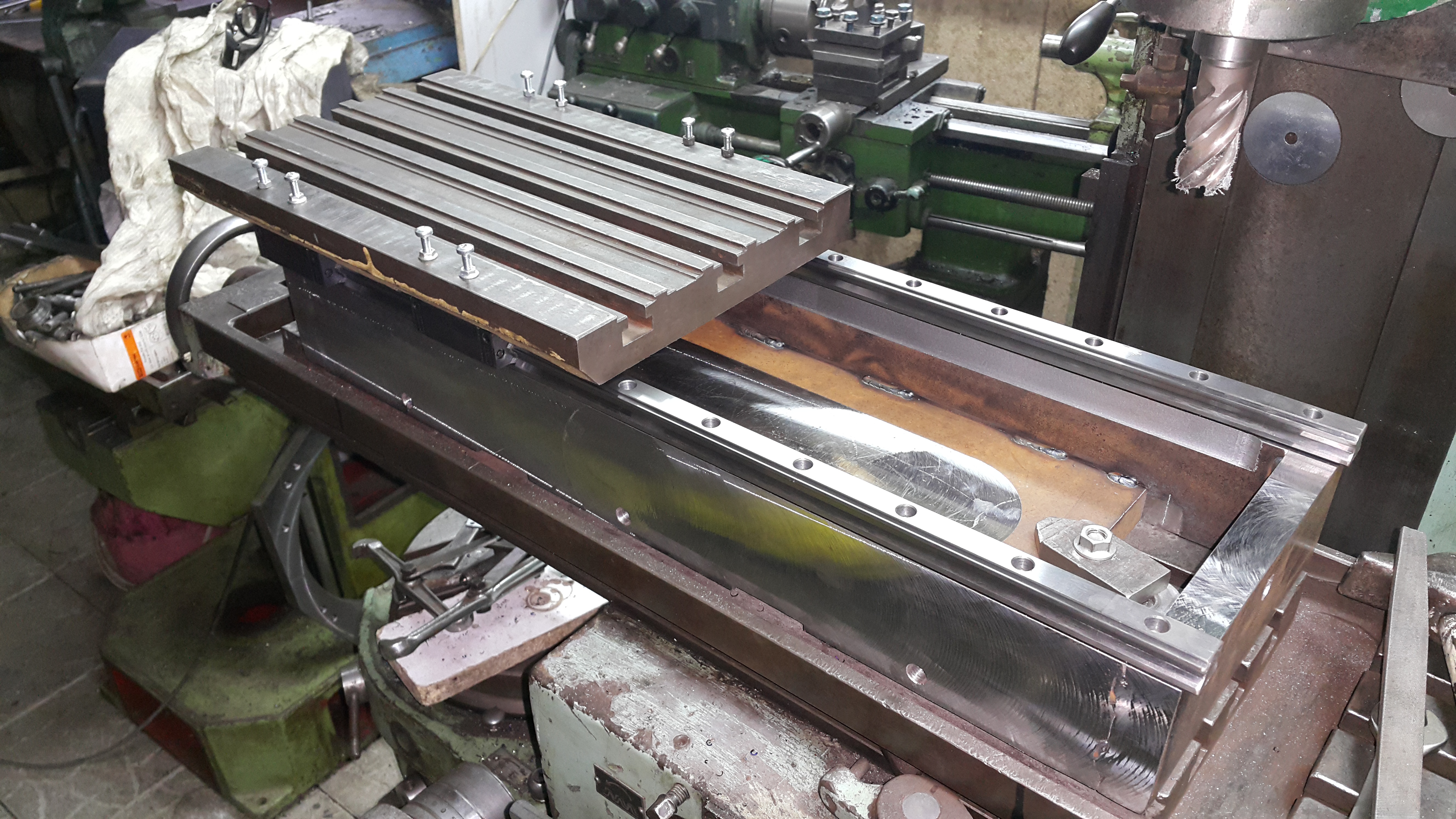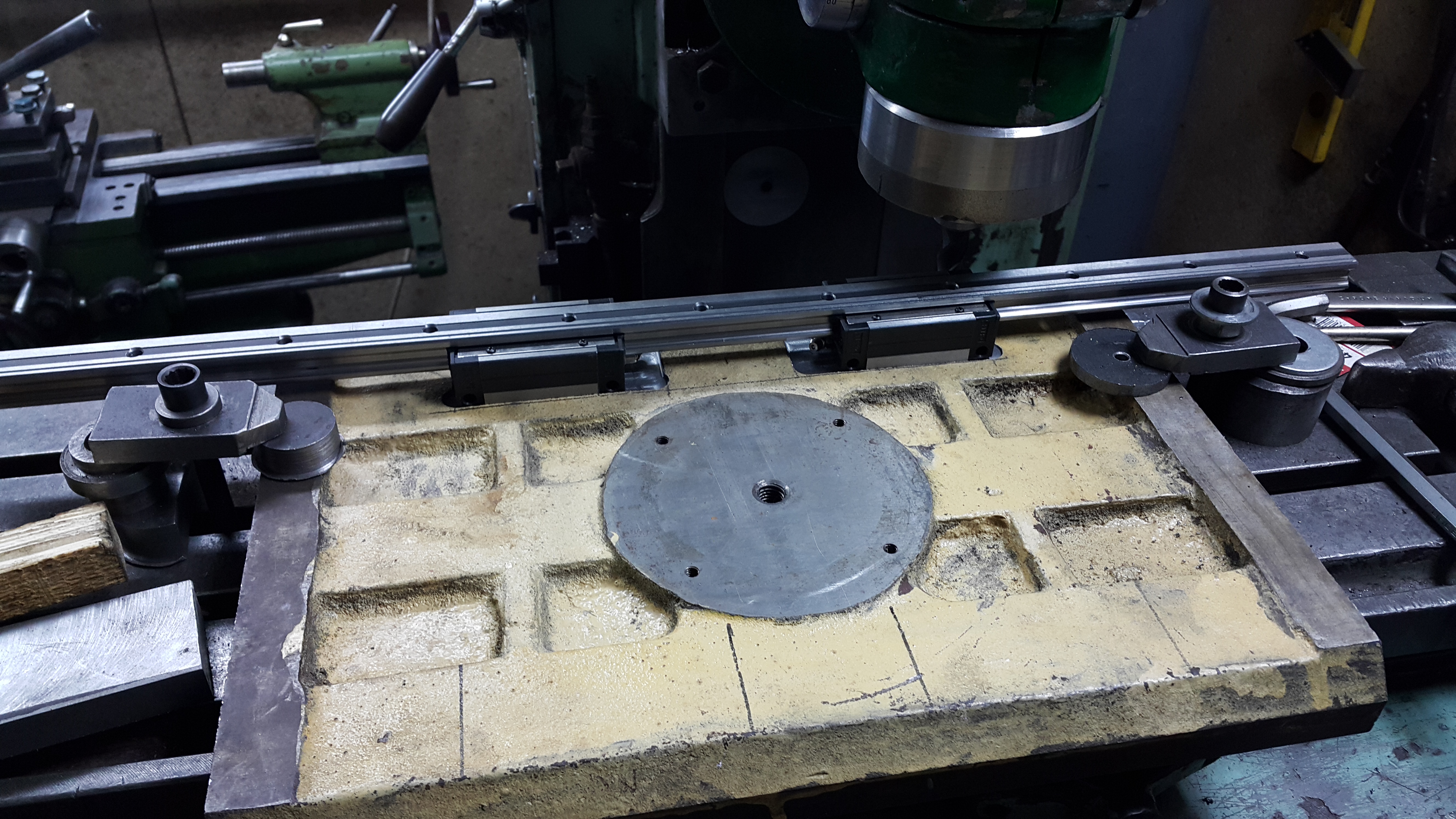 Потом перестроил станок с голизонталки в вертикалку и фрезеровал посадки под рельсы. Куча выставлений куча перестановок так как ход стола станка всего 550х160 а деталь длиной 640. Но вроди все получилось, на длине 600 укладывается в сотку. Думаю после всех работ отвести на шлифовку еще. Для пущей точности. Теперь надо насверлить отверстий и нарезать кучу резьб. И тогда уже продолжать с основанием а затем с изготовлением крепежа под опоры, гайки и двигателя.