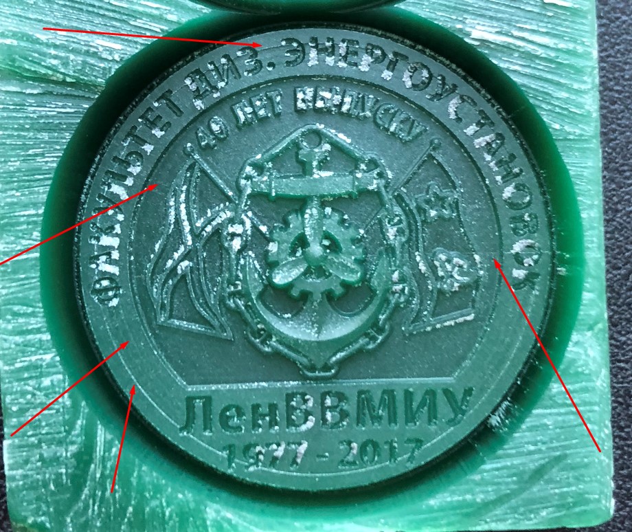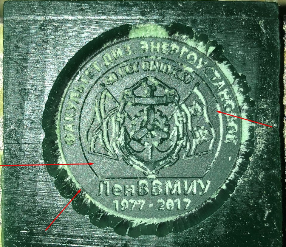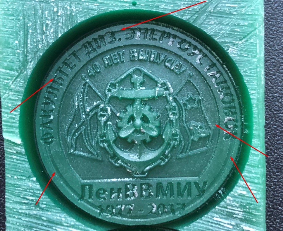 Так же, заметна прямая полоса по центру... Особенно видна справа посередине. Это место где фреза останавливается и начинает движение по дуге в обратную сторону. Судя по всему, в месте остановки есть некое биение или что-то типа того, что она врезается в воск... и оставляет след.