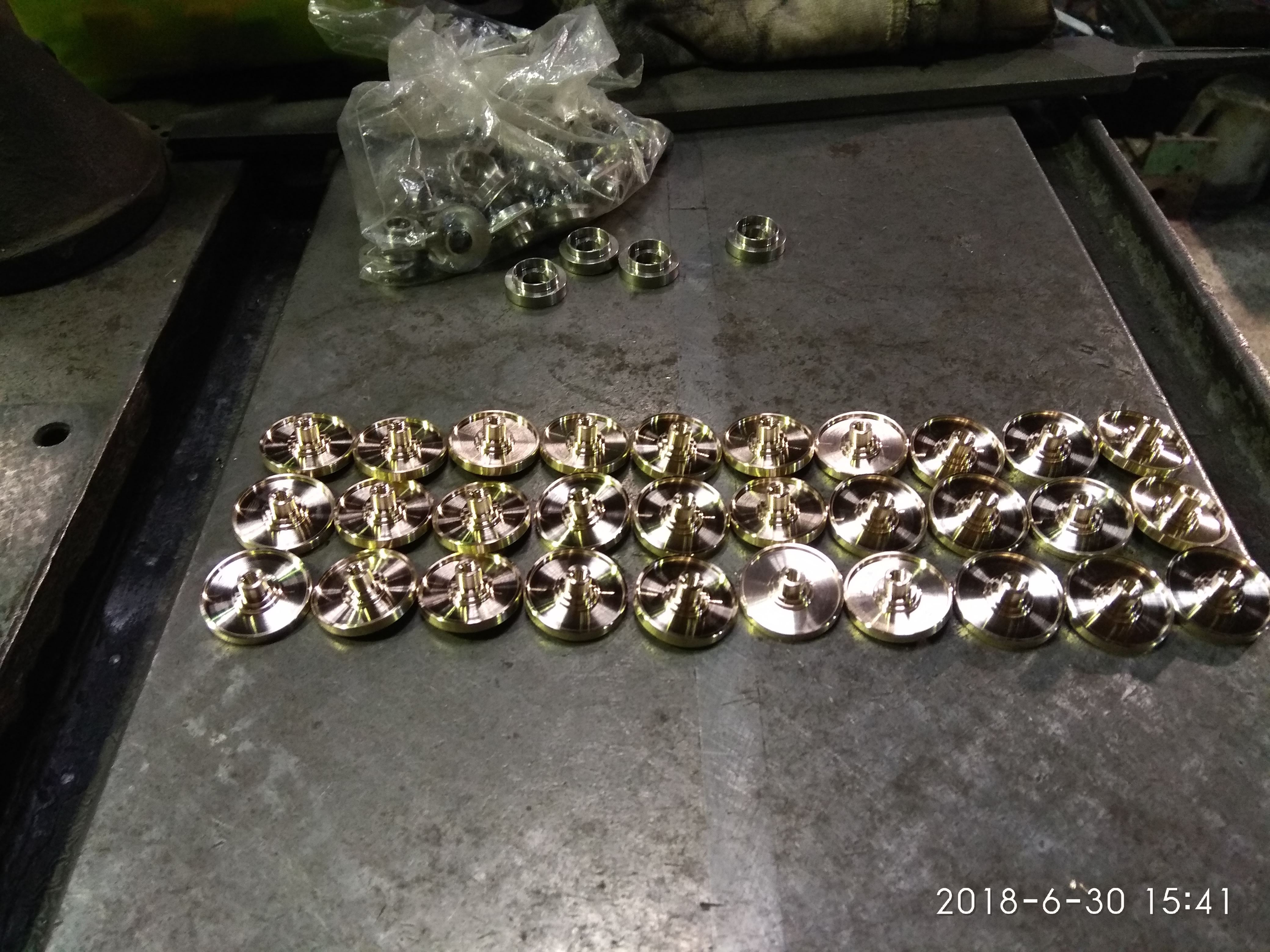 Оськи разные.. с посадками под пошипники.. Ну и цветнина. какието шкивочки хитрые. латунь и медь. профиль хитрый... выступы и канавки шириной 1мм и радиусом 0,5.. типа сильфона поверхность..