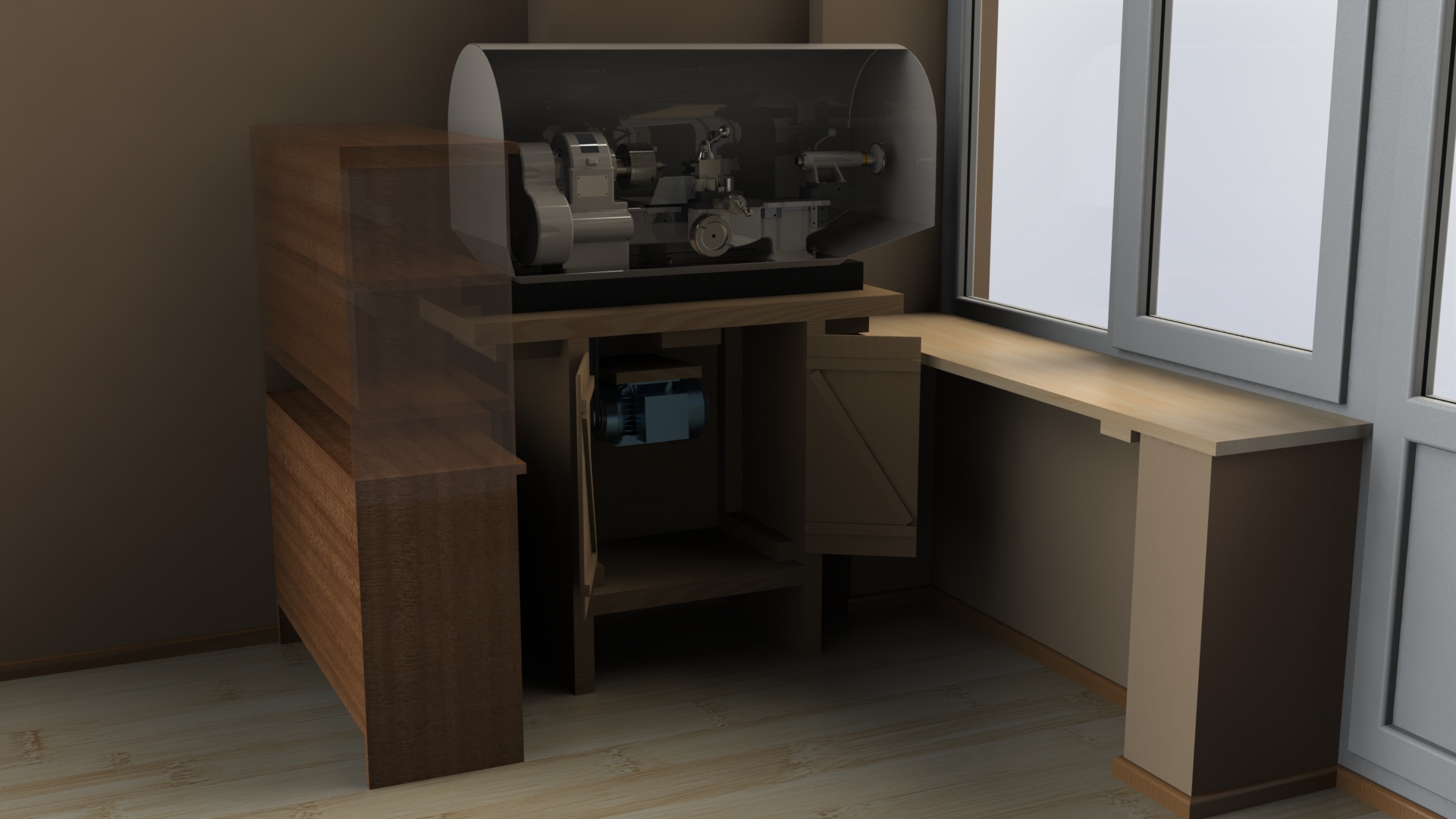 А верхнюю часть скорей всего сделаю из нескольких частей оргстекла и съемную, что бы можно было "завернуть" на петлях (как рукава закотить), либо снять.