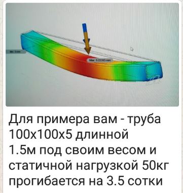 http://ntz-holding.ru/raschety/trubnyj-kalkulyator.html - погонный вес трубы 14.5 кило. То есть 30 кило труба (распределённая нагрузка) = 2 сотки (по калькулятору выше). Плюс 50 кило сосредоточенной в центре = 5 соток.Skydiving писал(а):Думаю, что эти калькуляторы недействительно с реальностью. Вот мне прислали пример той же трубы:moscow писал(а):И вот что меня заинтересовало. Стальная труба 100х100х5 гнётся на те же 0.08 мм под весом 100кг