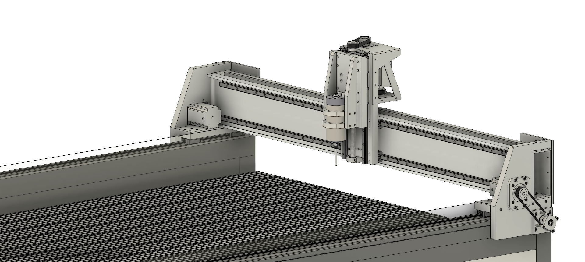 С новым годом господа! Появилось свободное время подумать над станком, прорисовал детализацию боковин, крепление моторов и кожухи защитные. Кроме этого удалось спрятать рельсы оси X за ленточную защиту. Также планирую ленту кинуть и на ось Y, как минимум на рельсы, но пока еще не прорисовал. Есть большой затык с осью Z. Там замкнутую ленту не поставить из-за особенности конструкции. Появилась мысль реализовать ленту на возвратной пружине. Попробую в следующей итерации прорисовать.