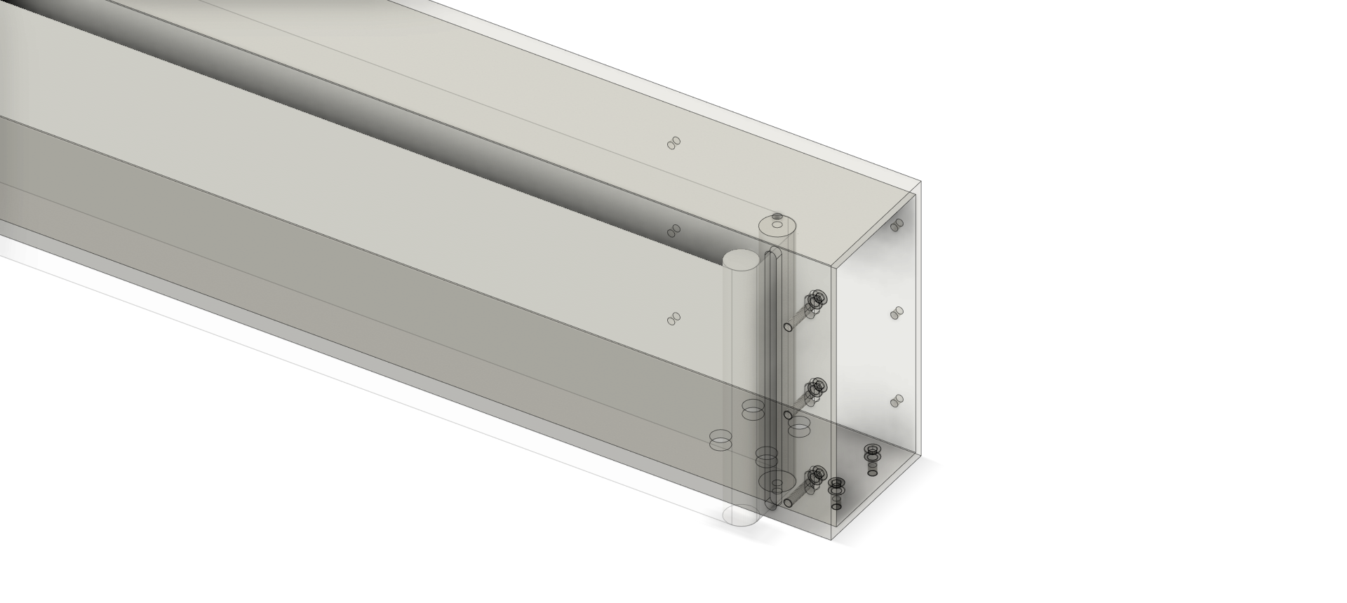 Немного "подумал" над узлом крепления балки к боковине, по сути остается только одна базовая плоскость(с рельсами), по которой выставляем балку. По вертикали дал контролируемый винтами зазор в 5мм, чтобы можно было выставить ровно обе стороны. "Косынка" сзади фиксирует и балку и боковину, создавая замкнутый контур.