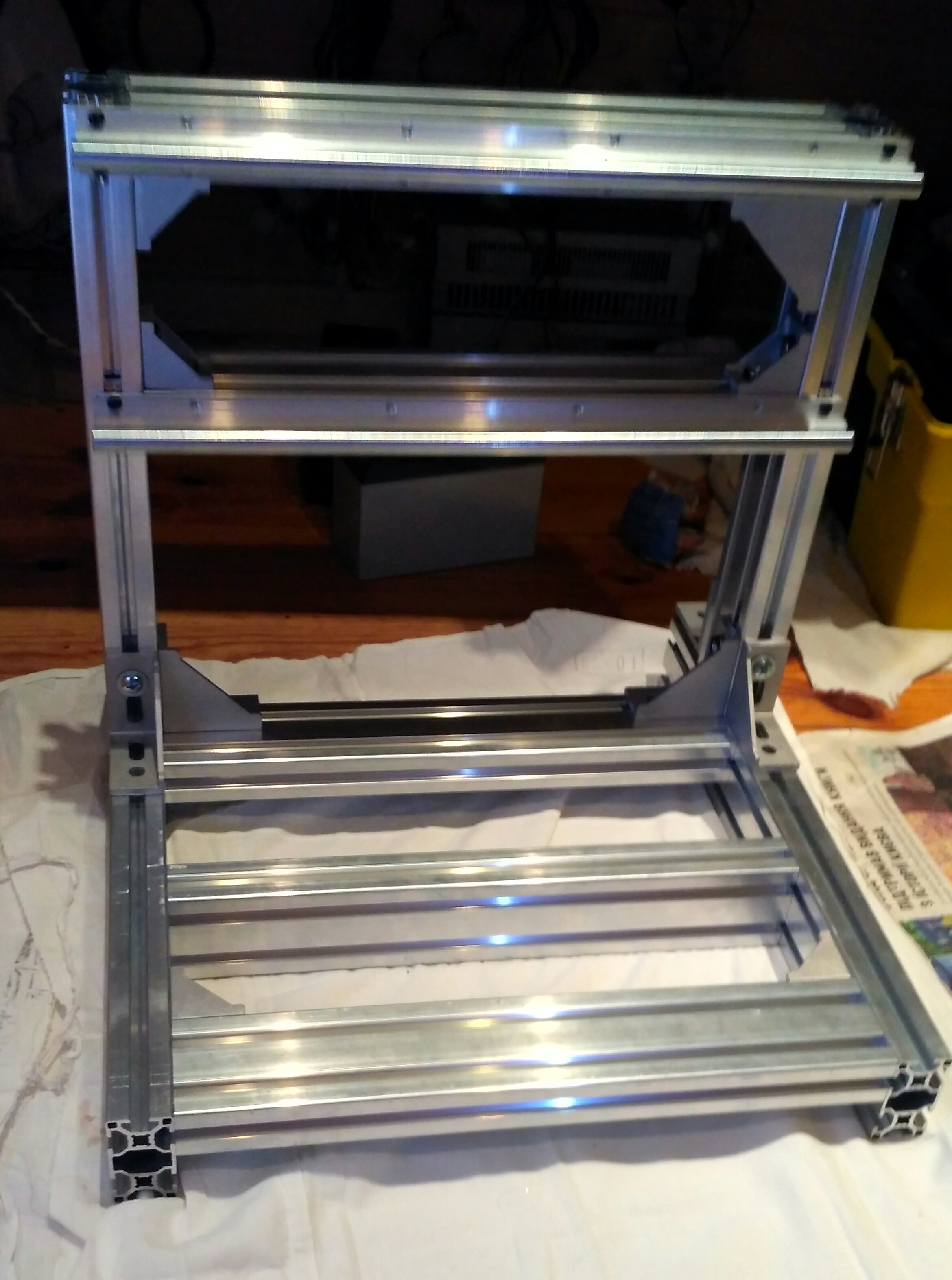 Я же писал про фанерный (типа моего) и каждый слой из них можно прикрутить как к задней стенке, так и к боковым треугольникам. (даже в вашем случае без треугольных боковин не обойтись, и задняя стенка тоже желательна хотя бы от верха балки и до стола/заготовки/крепления. что бы не вперлось во время работы)