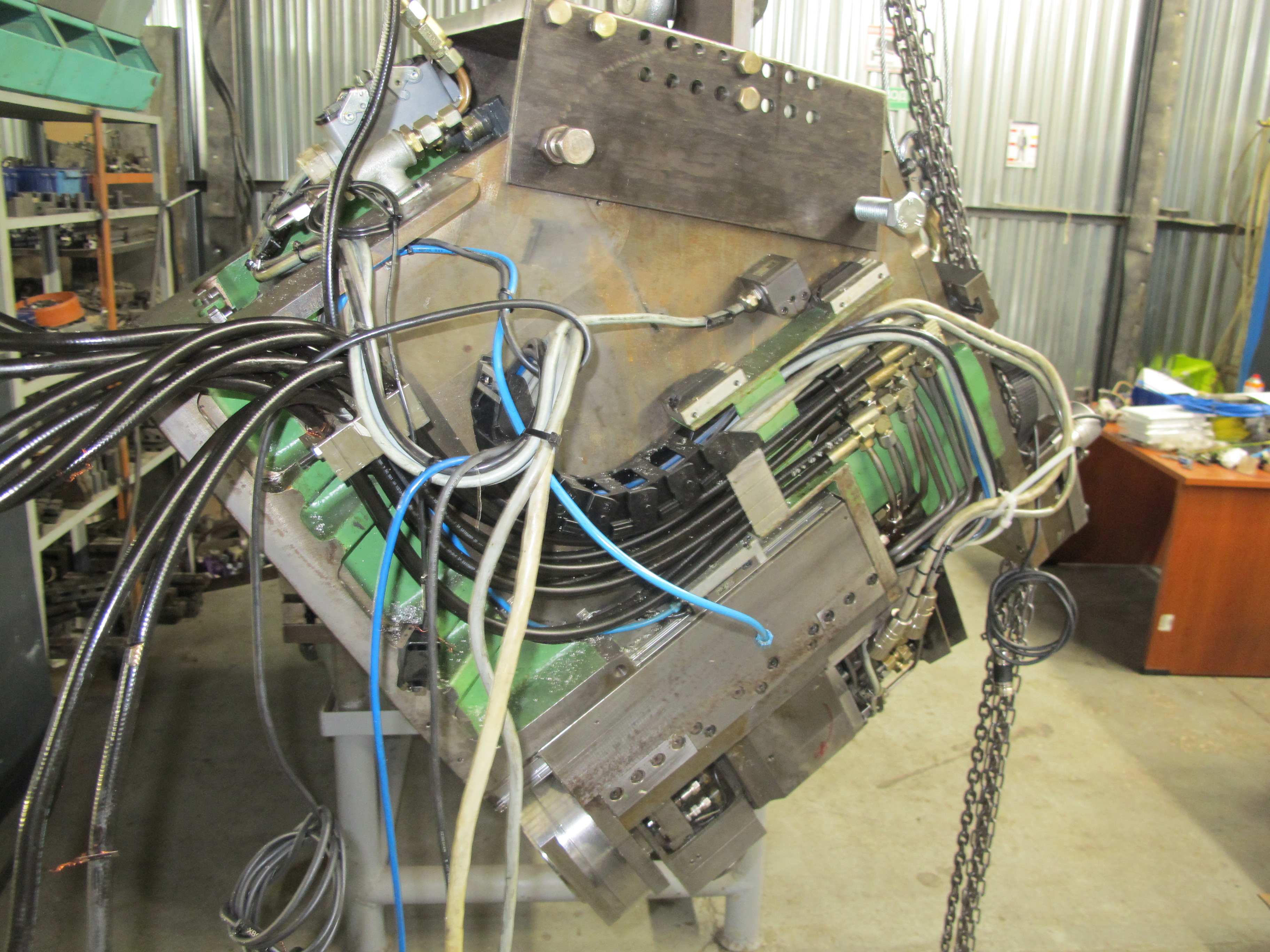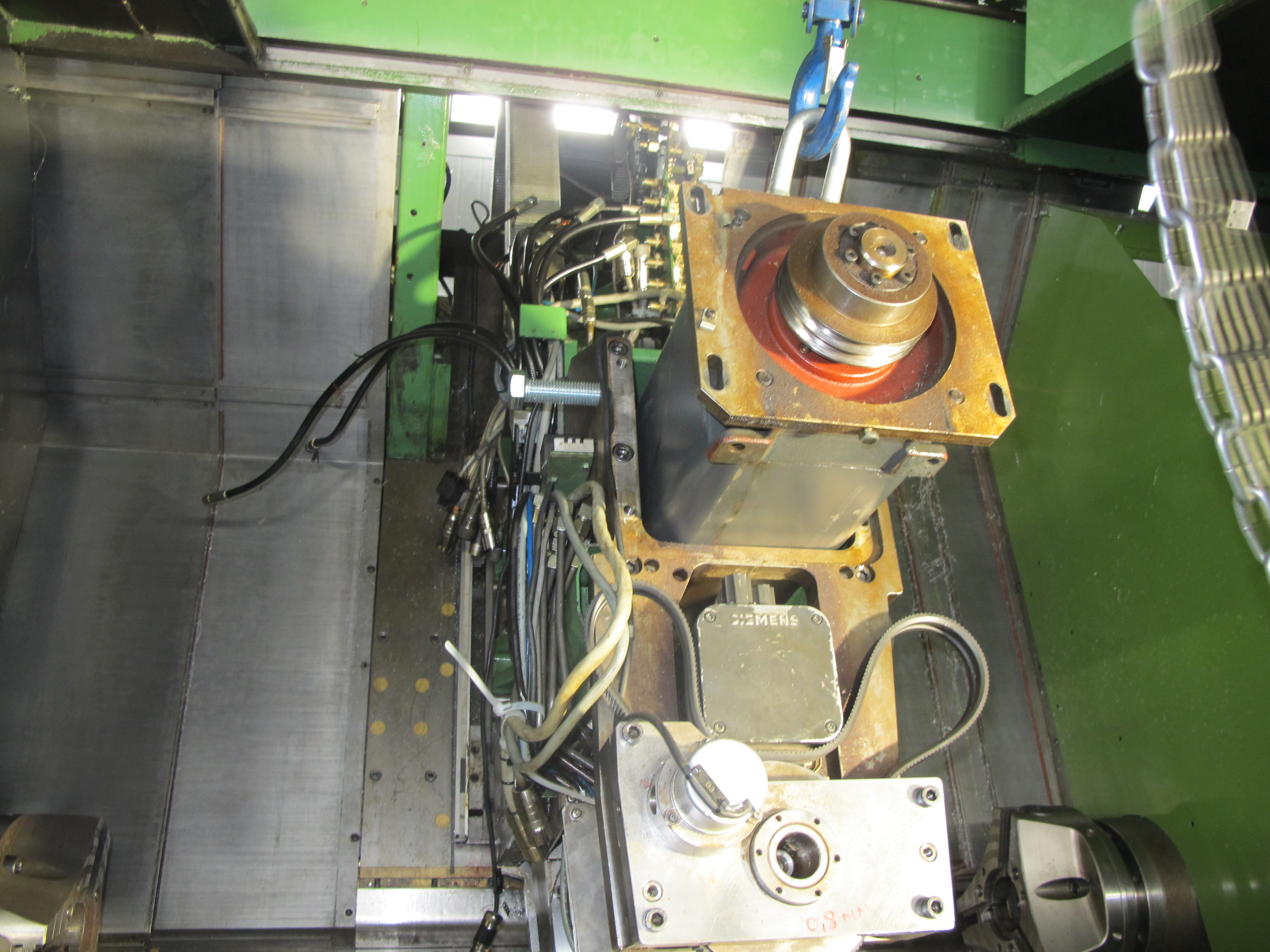 На неделе свершили подвиг - сняли верхнюю голову в токарном. Где у неё центр тяжести было не понятно. После некоторых раздумий сделали не большую траверсу с возможностью перемещения подвеса. Сначала сняли 9 килловаттный мотор шпинделя, который сидел в кармане и имел жидкостное охлаждение.