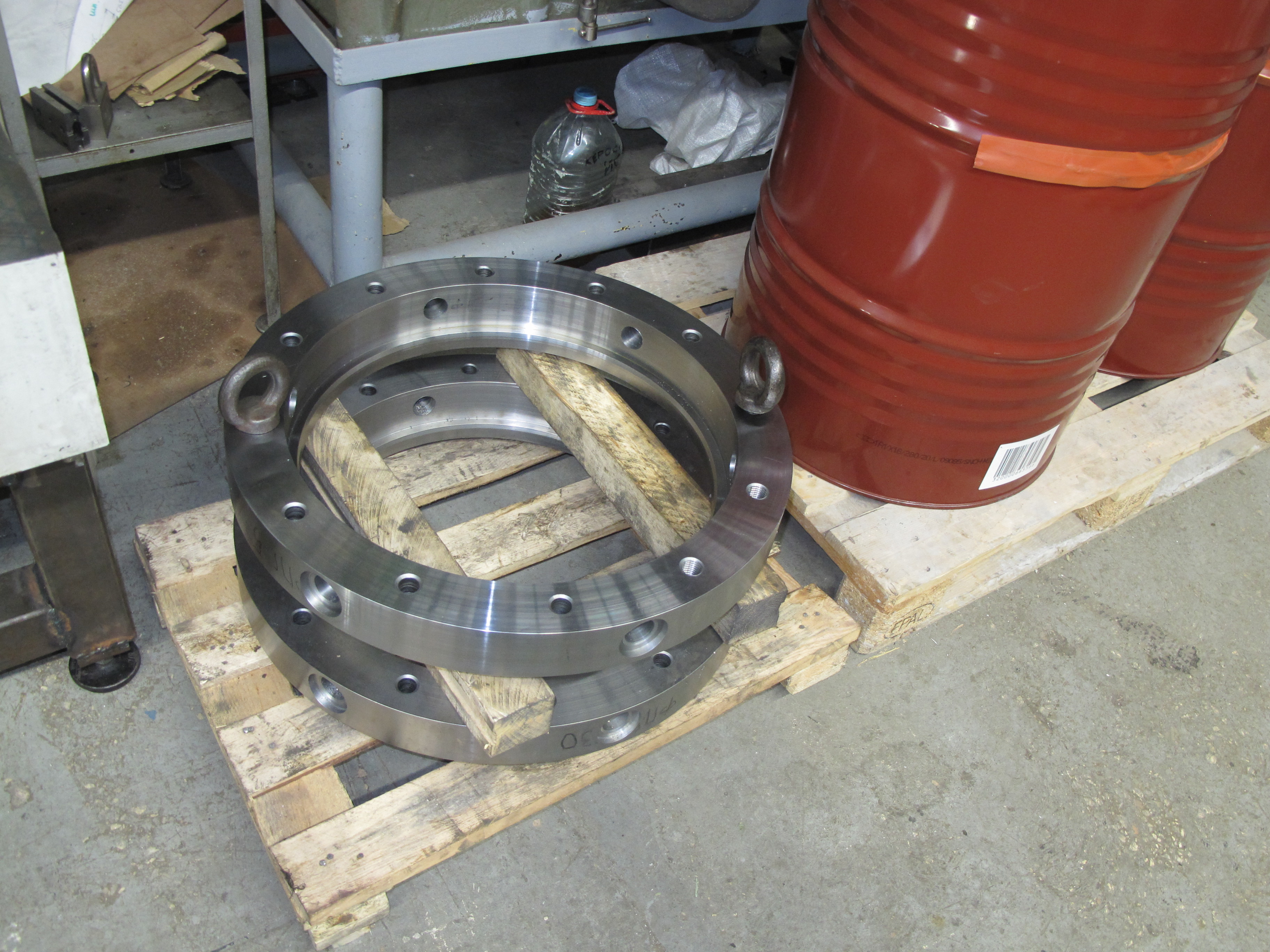 Фланчики. Какая то морозостойкая сталь, довольно вязкая. Чугунятина метр на два. Стол под неё Ну и куча других деталей.