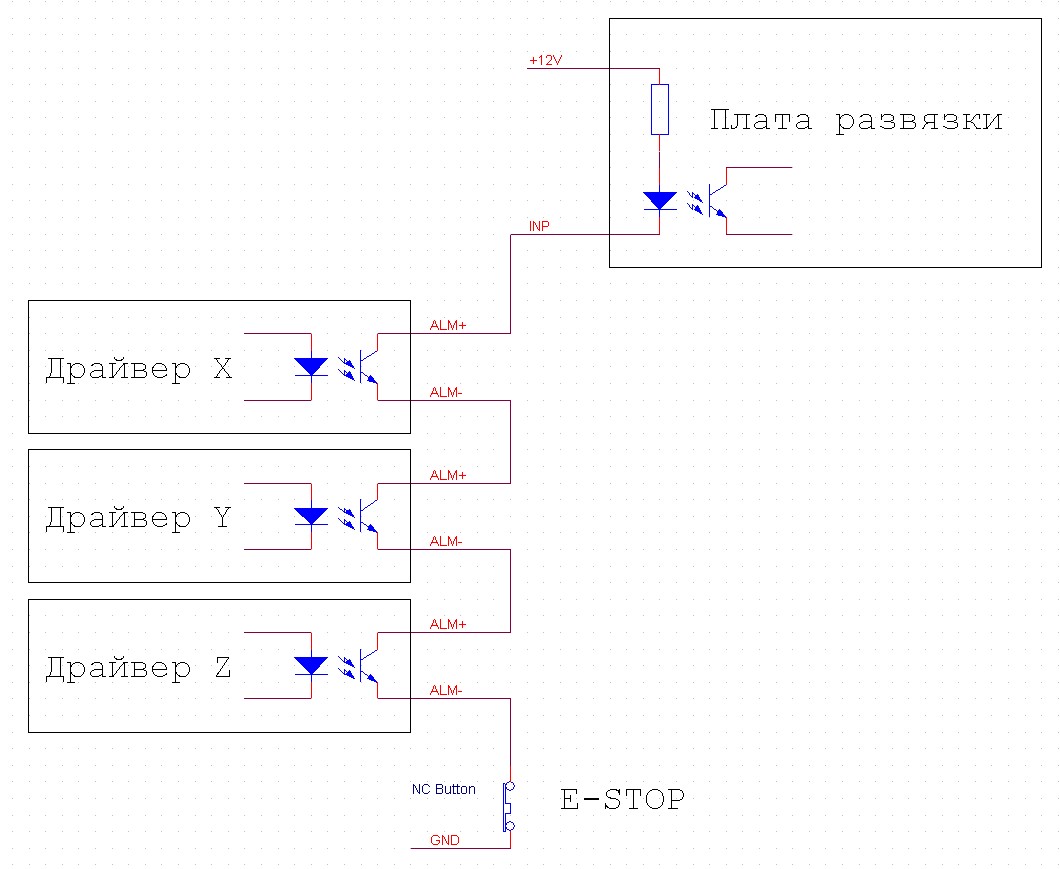 Сразу спрошу, если окажется, что Alarm на драйверах NO (т.е. при нормальной работе цепь разомкнута, при аварии цепь замыкается), и если это программно в настройках драйвера не поменять, можно ли все драйвера моторов (клеммы ALARM) подключить параллельно, и одним проводом с 2 жилами запитать на плату опторазвязки? У меня на плате UB1 есть клемма на замыкание контакта, который запускает блок безопасности E-stop (если я правильно прочитал схему)
