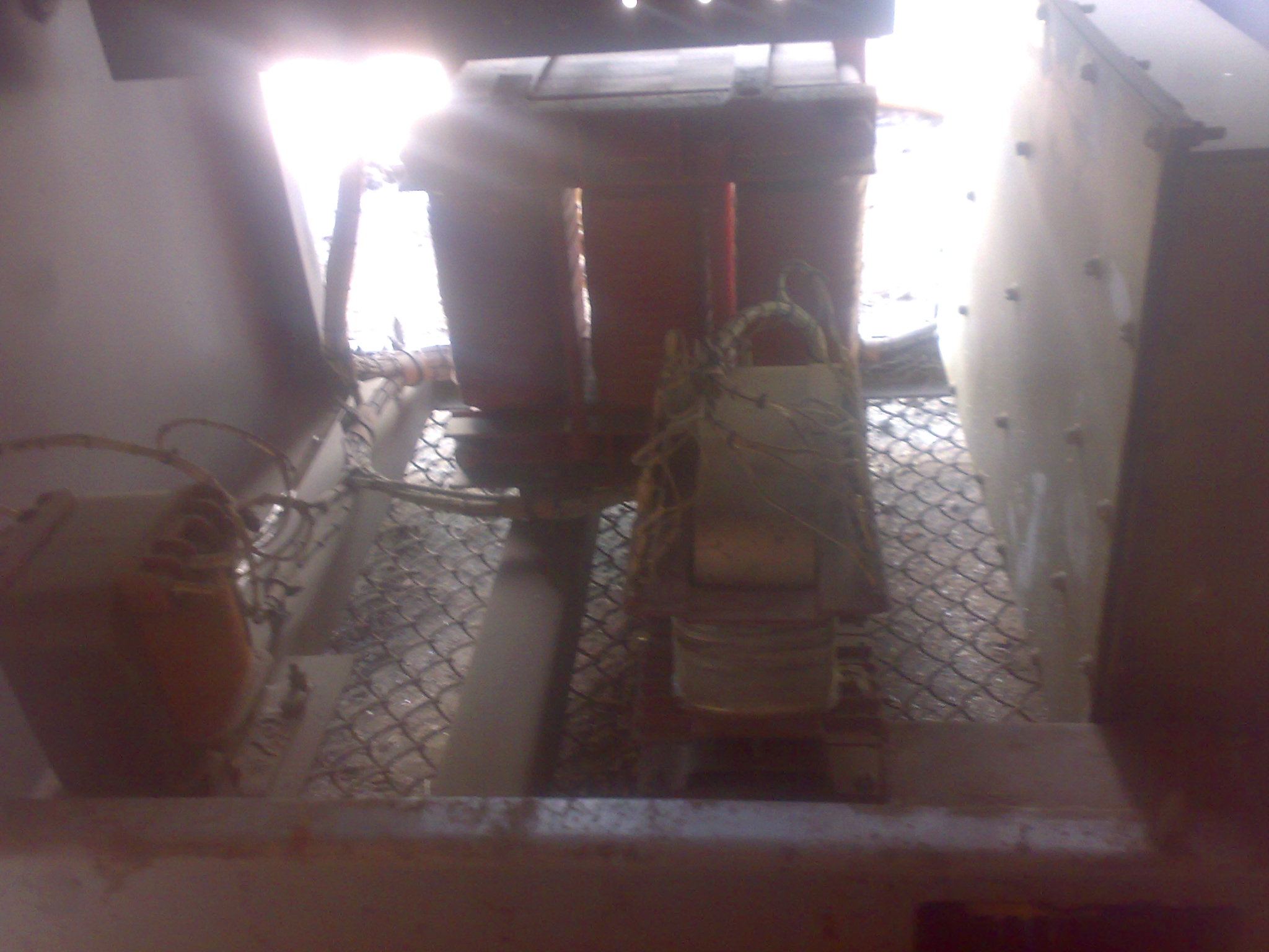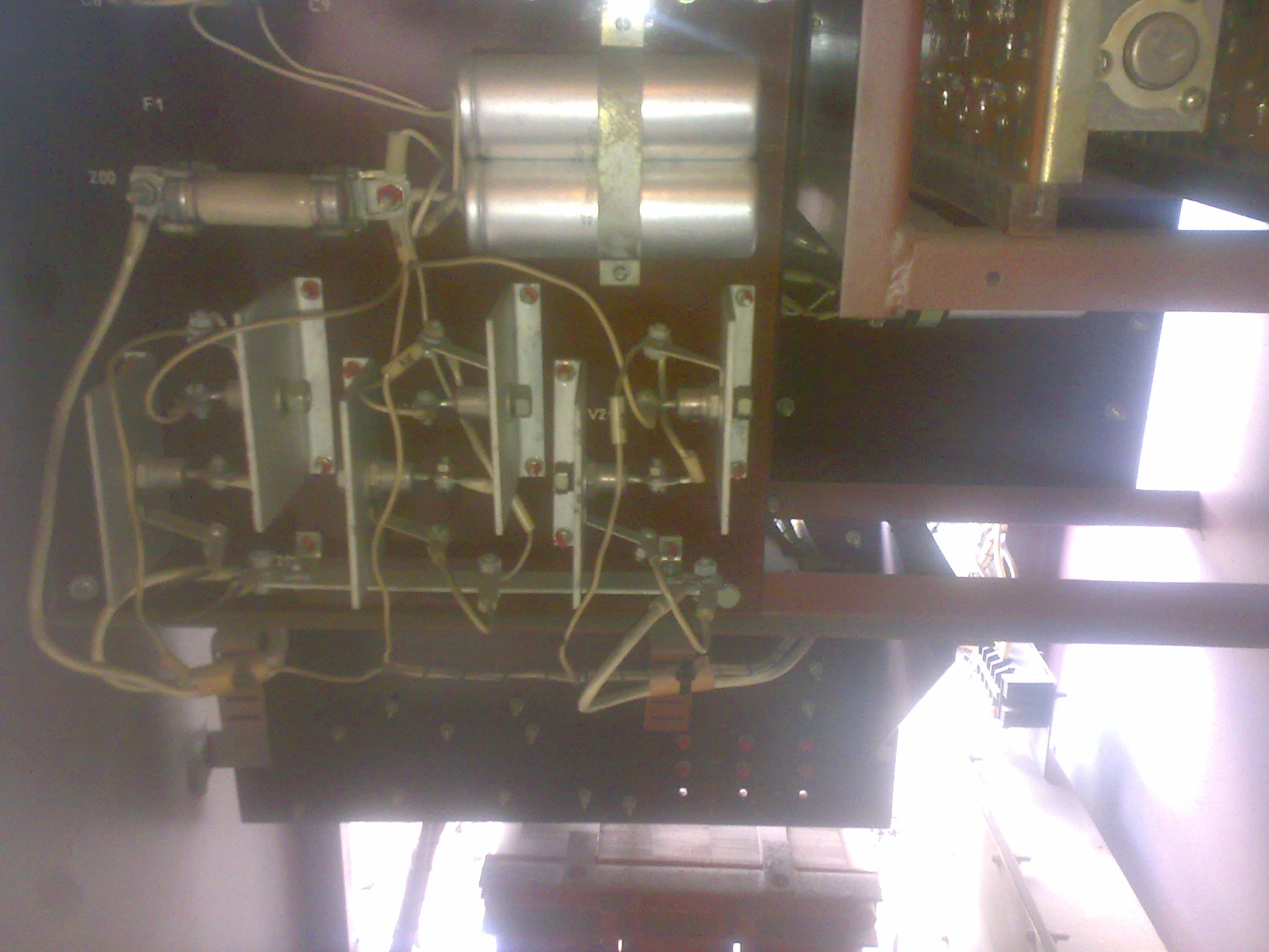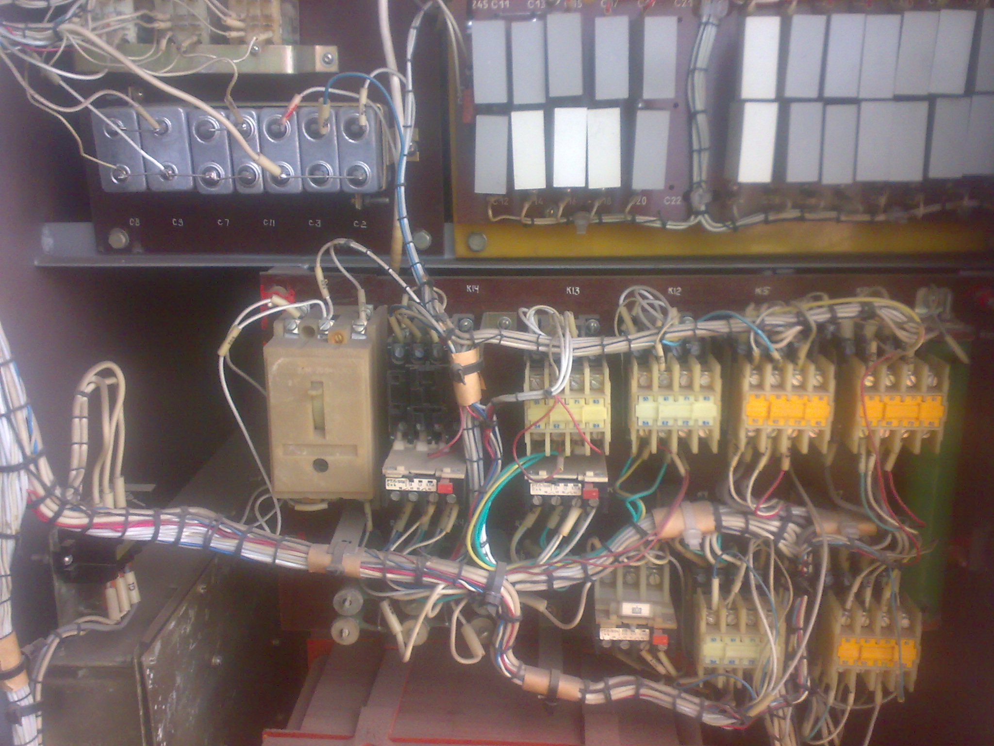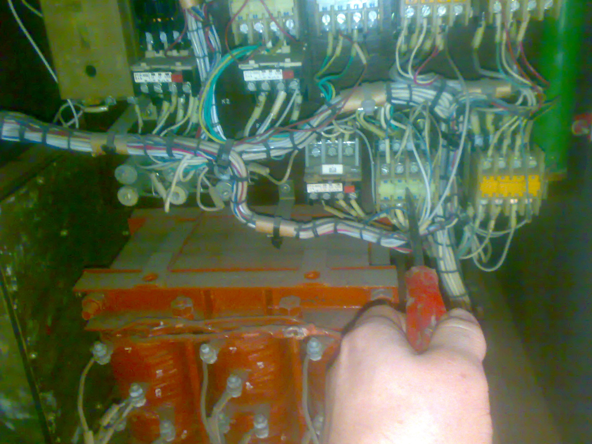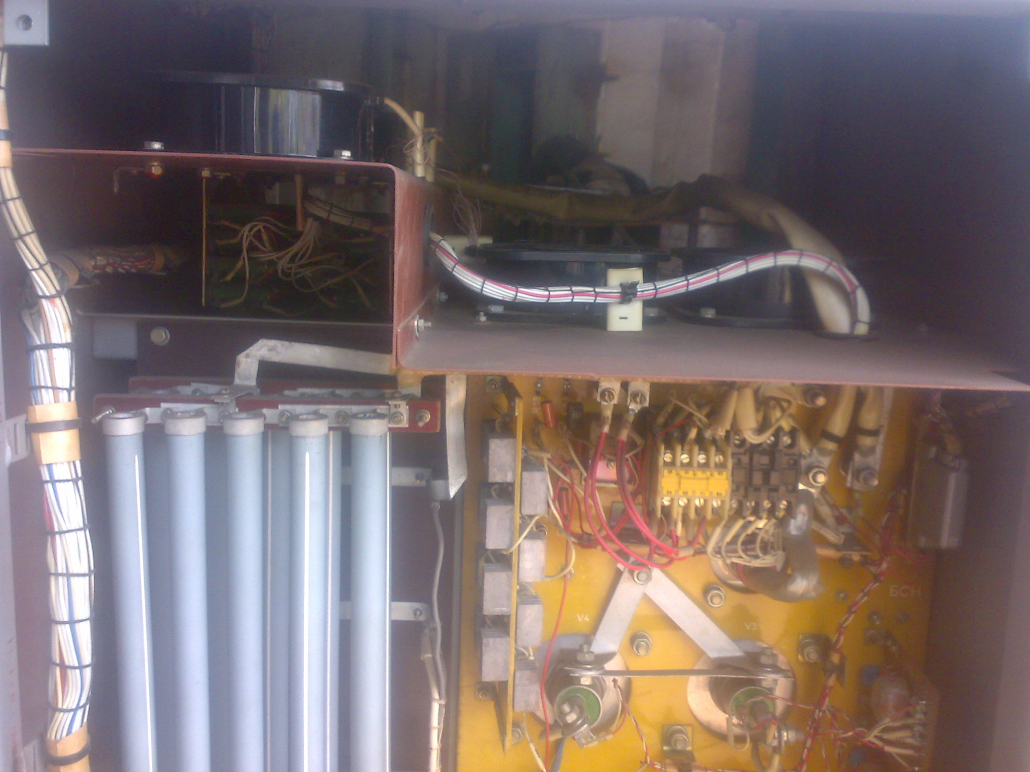 Снизу 2-й автомат (я думаю это магнитное реле) при принудительном включении начинают шуметь вентилаторы, оба (средние на фото) трансформатора, на панели удается выбрать частоту и амплитуду, но между "+" и "-" все равно тихо, при их КЗ тоже не искрит. ПРобовал параллельно с ключом К4(тот 2-й автомат) еще нажимать К5,6,7(желтые)-при их нажатии появляется свист. При нажатии К12,13,14 свиста нет. Но во всех слячаях искра не появляется.