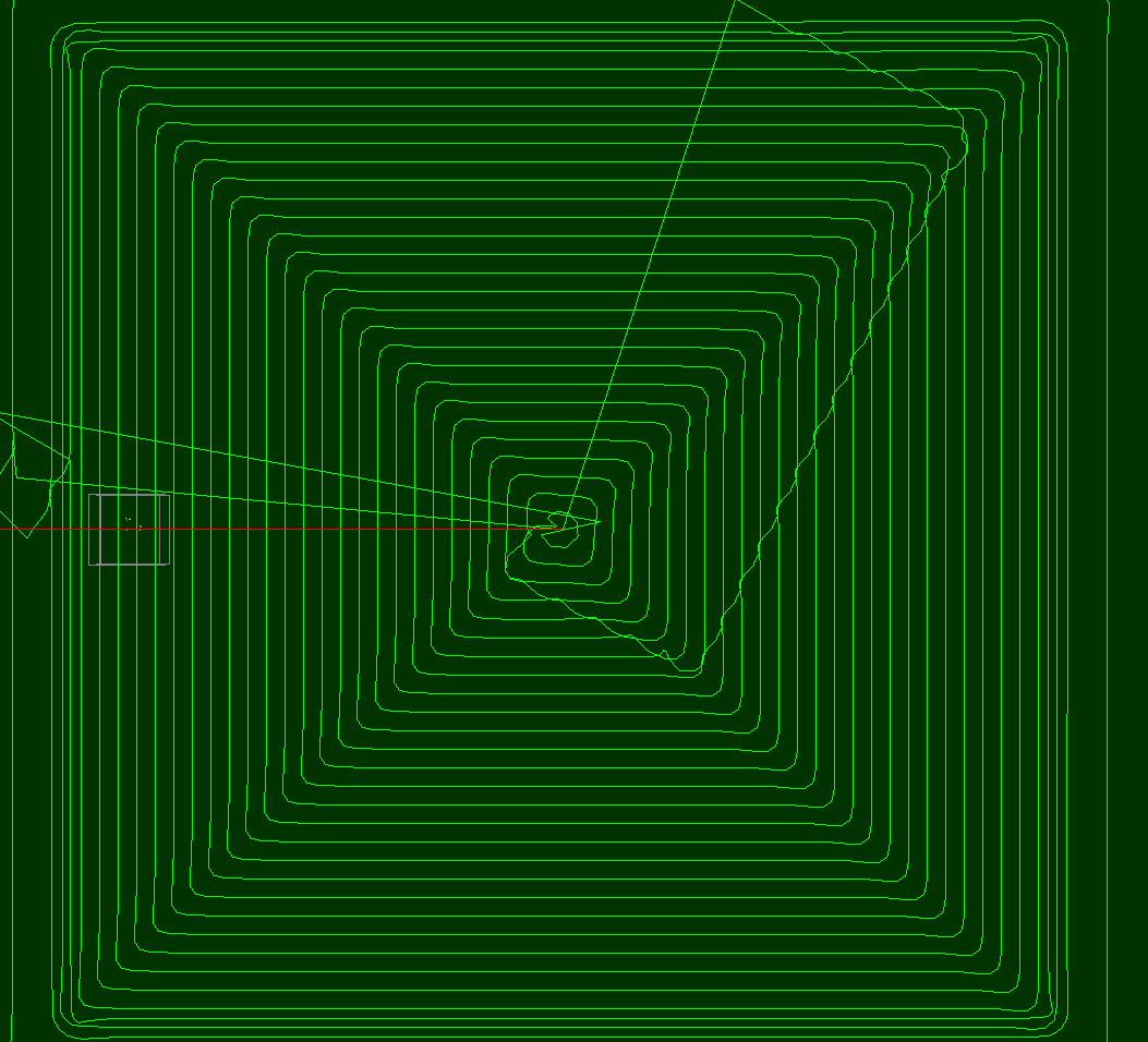 Симуляция показывает какую то фигню. Несколько мм фреза идет вертикально как сверло, потом делает несколько движений в плоскости XY и цикл повторяется.