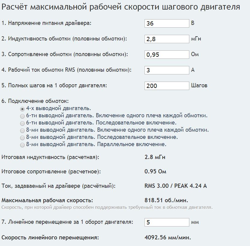 Если вбить его характеристики в калькулятор для ШВП 1605 и питания 36В (у меня 48В), то получим вот такое