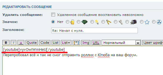 Перепробовал всё и так не смог отправить роллик с Ютюба на ваш форум.