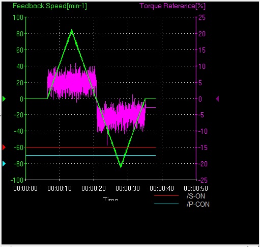 Для экспериментов в Jog режиме проблематично выставить скорость 10 rpm, так как это максимальная скорость, ограничение которой рассчитывается исходя из разрешения энкодера и соотношения электронной редукции. В моем двигателе энкодер 13-битный, т.е. 8192 тика на оборот, поэтому выставить максимальную скорость ниже чем 150 rpm не получается. Поэтому, просто воспользусь длинной фазой разгона до этих 150 rpm, он происходит по линейному закону. Т.е. в Jog-режиме можно выставить время разгона, например 10 сек, и на сервопак будет подаваться управление от 0 до 150 rpm в течение этих 10 сек. Если тревел короткий, то можно разогнаться не боле 10 rpm. Вот так я и сделал. Например, на видео ось ползает на 0.2 мм туда-сюда, разгоняясь к середине пути до 10 rpm.