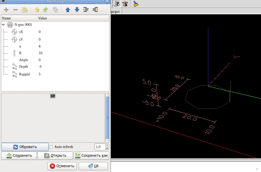 основные операции воплощенные в мастера можно подсмотреть в той же ngcgui:Nick писал(а):я тут еще задумался об токарке... только даже не представляю с какой стороны подойти к процедурам.