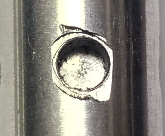 У фрезы торец плоский и при первом врезании край отверстия разбивается. Очень видно если фреза Ф3 и меньше. Естественно влияет вылет фрезы, материал фрезы и детали и форма поверхности детали.